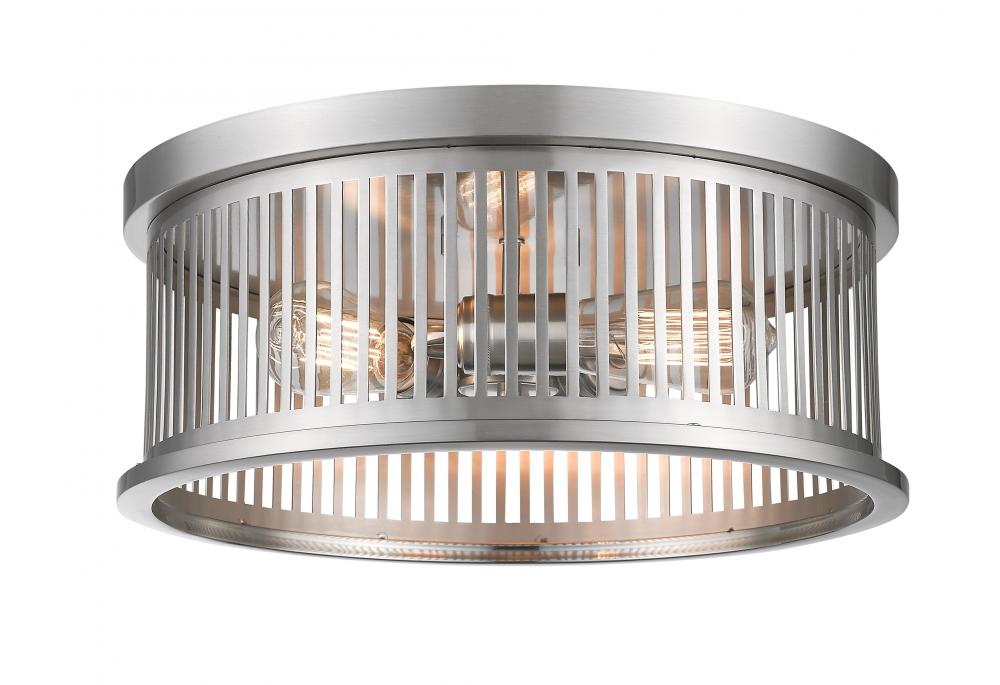 A trio of vintage bulbs nestle in a linear-inspired steel housing that makes up this exceptional fixture. Offering a decidedly industrial attitude, this three-light brushed nickel finish round flush mount ceiling fixture delivers a charming look.
