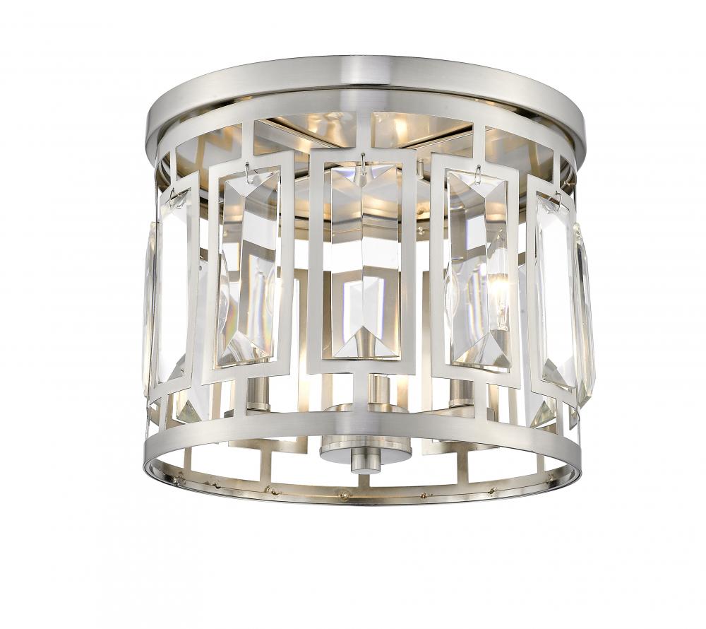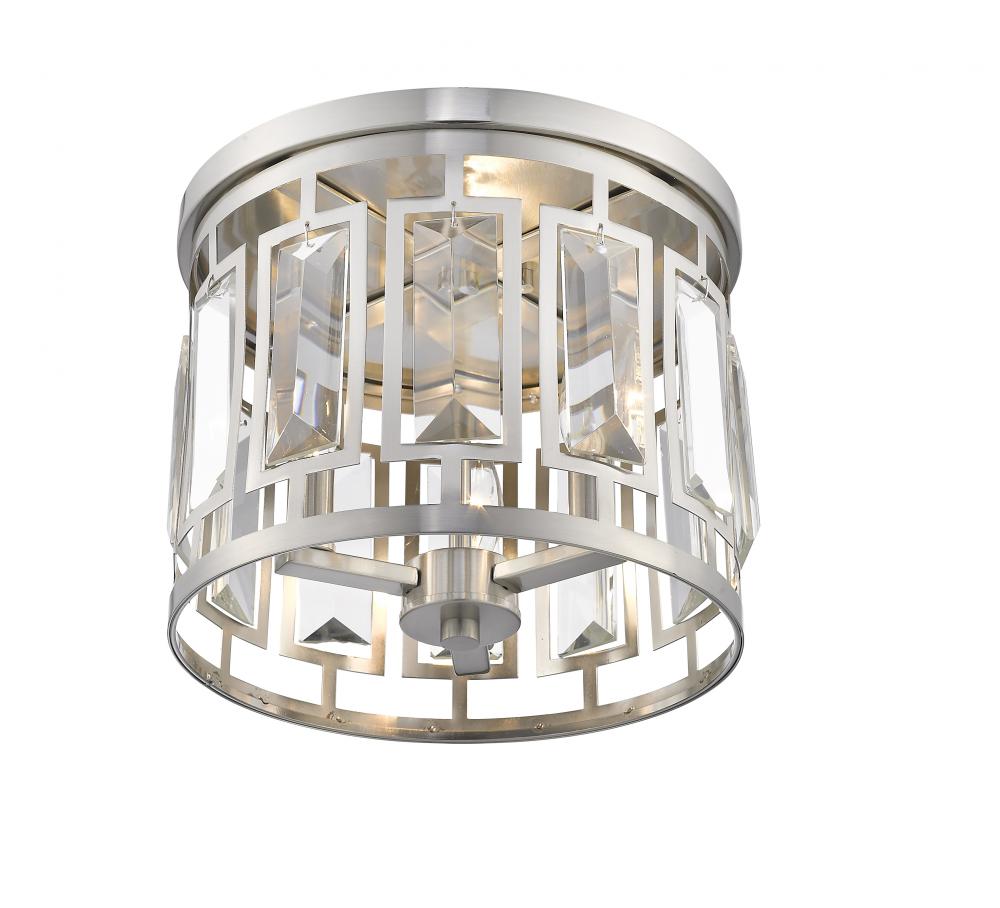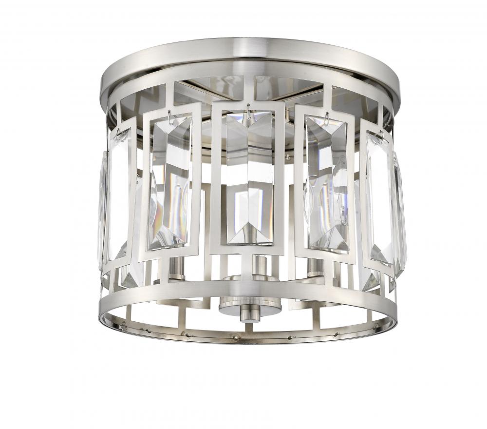 Add a decadent look to modern d?cor with this exceptional three-light flushmount ceiling light. Gorgeous brushed nickel finish steel and cut crystal panels emphasize the geometric-inspired character, softened with the romantic flavor of candelabra-style bulb bases.