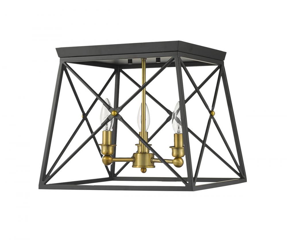 Indulge in an exercise of geometrics and stunning interior d?cor, adding this three-light flush mount ceiling light to a main living space. A dramatic contrast of Matte Black and rich Old Brass finishes combine in a metal cage shade and bulb mounts, delivering a provocative look for a transitional design motif.