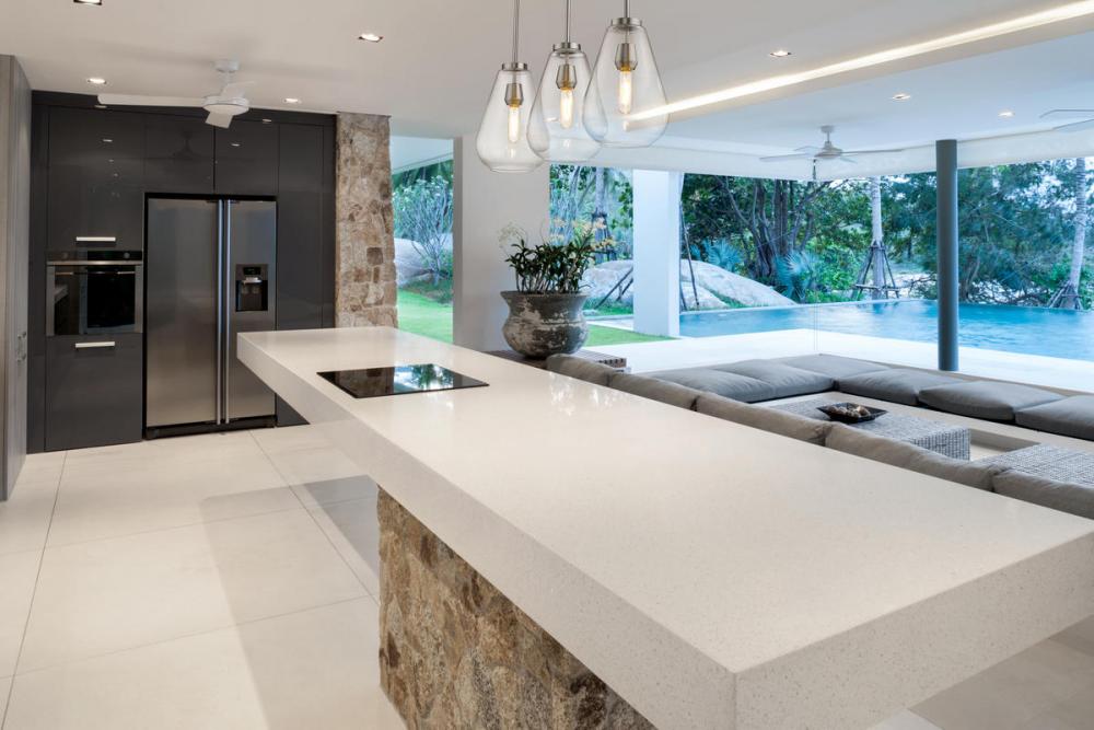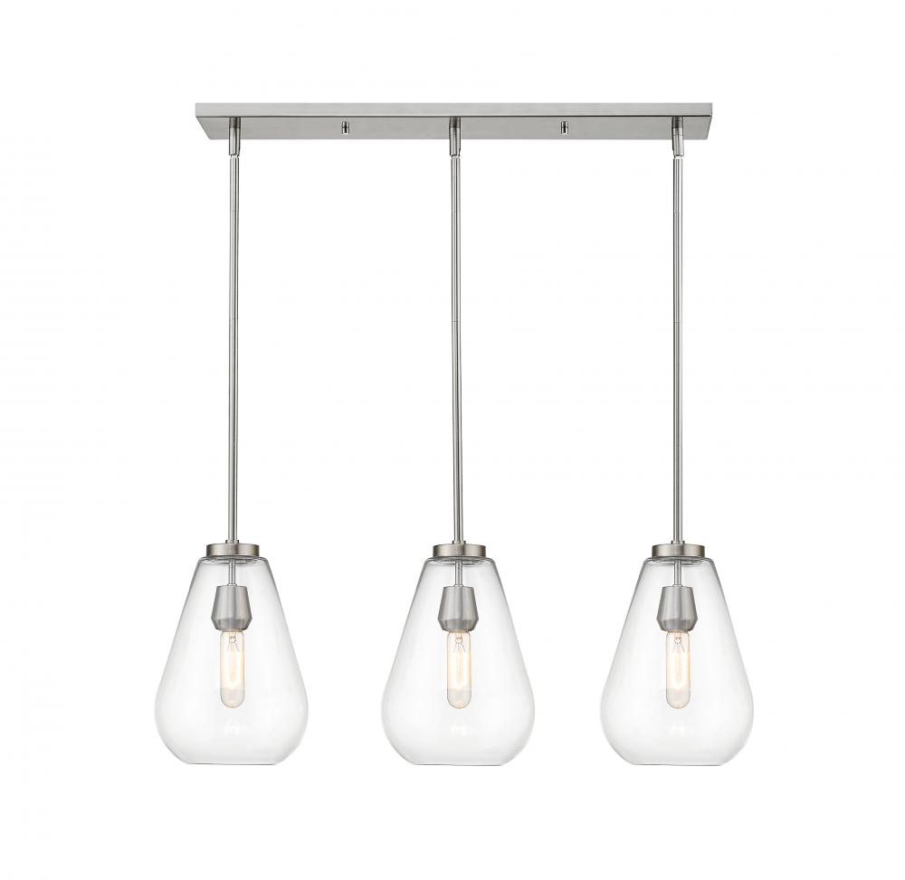 An eye-catching billiard style three-light fixture perfectly encapsulates the modern aesthetic. Tapered bell-shaped shades are made from clear glass, suspended from a sleek steel frame with a brushed nickel finish. The fixture brings a chic cutting edge to a contemporary kitchen or dining room.