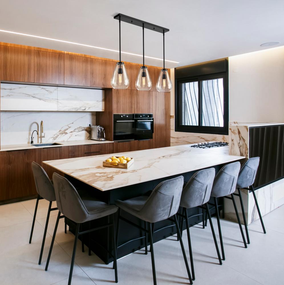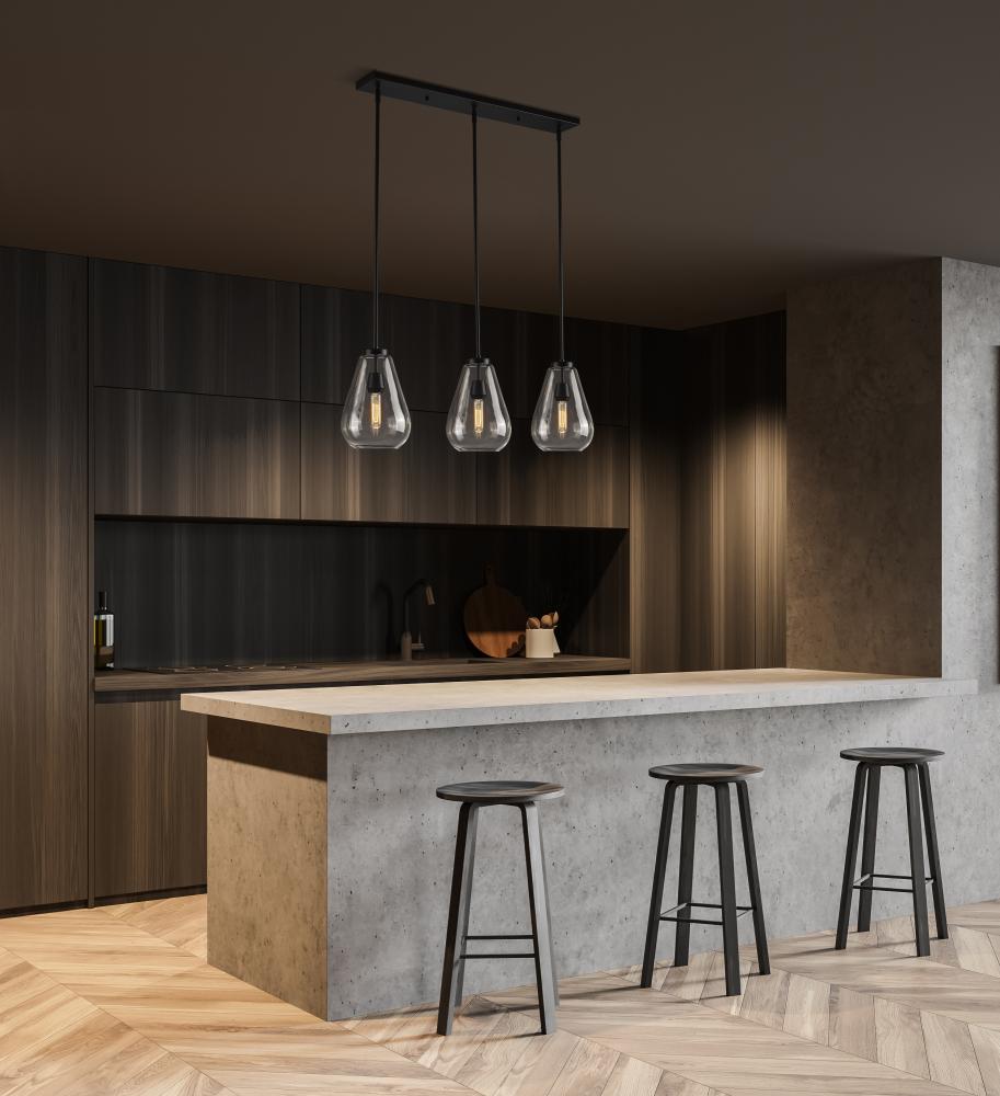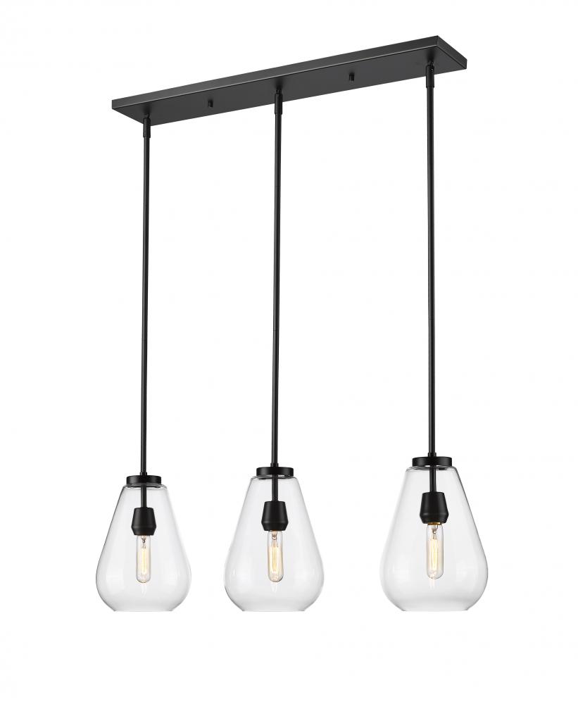 An eye-catching linear style three-light fixture perfectly encapsulates the modern aesthetic. Tapered bell-shaped shades are made from clear glass, suspended from a sleek steel frame with a matte black finish. The fixture brings a chic cutting edge to a contemporary kitchen or dining room.