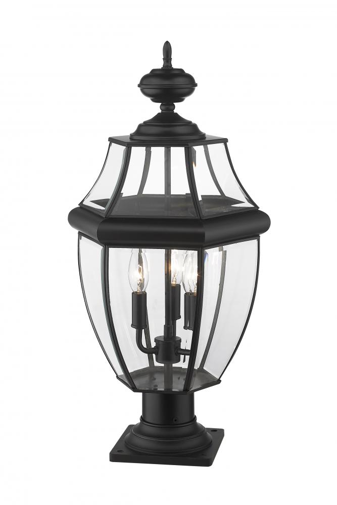This three-light outdoor pier mounted fixture adds a classic silhouette to the lighting in your patio, deck or other outdoor area. With its candelabra composition, the lamp provides soft, effective illumination. A multi-sided clear beveled glass shade has a black steel frame, creating an elegant impression.