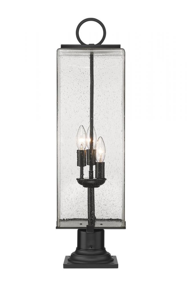 This sleek, coastal-inspired three-light outdoor pier-mounted fixture in black features will look perfect on your porch or patio. Coming with a black finish and seeded glass shade.