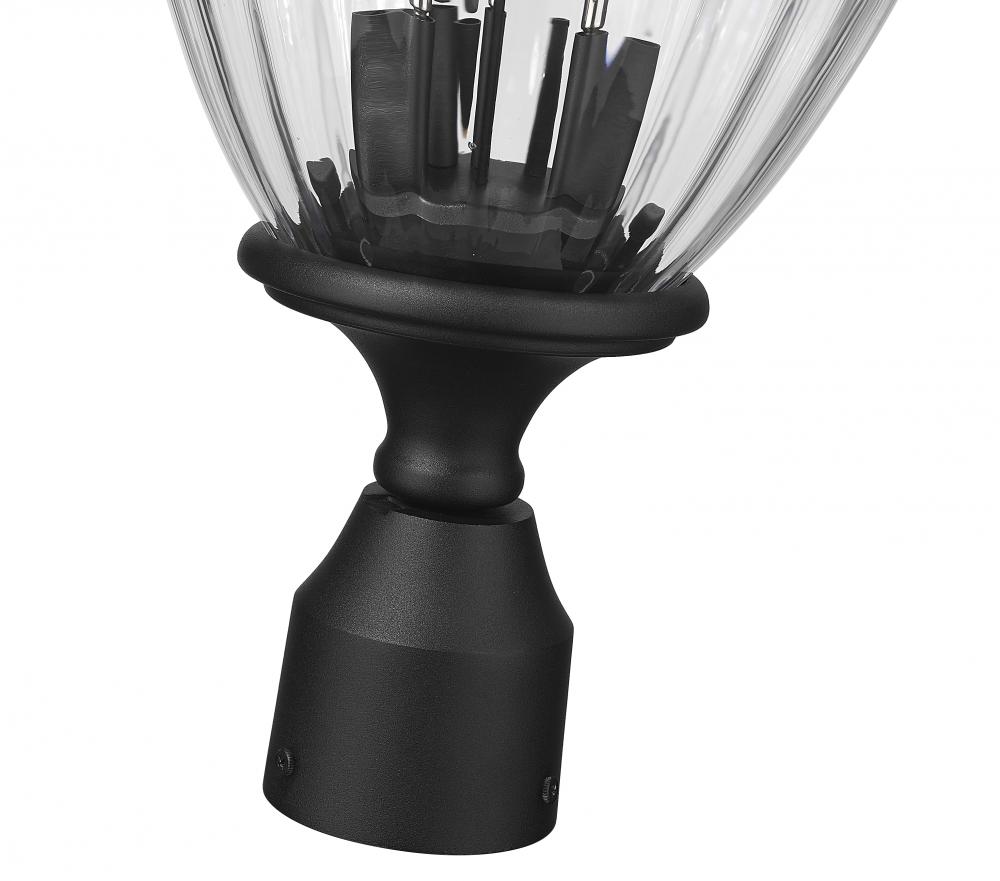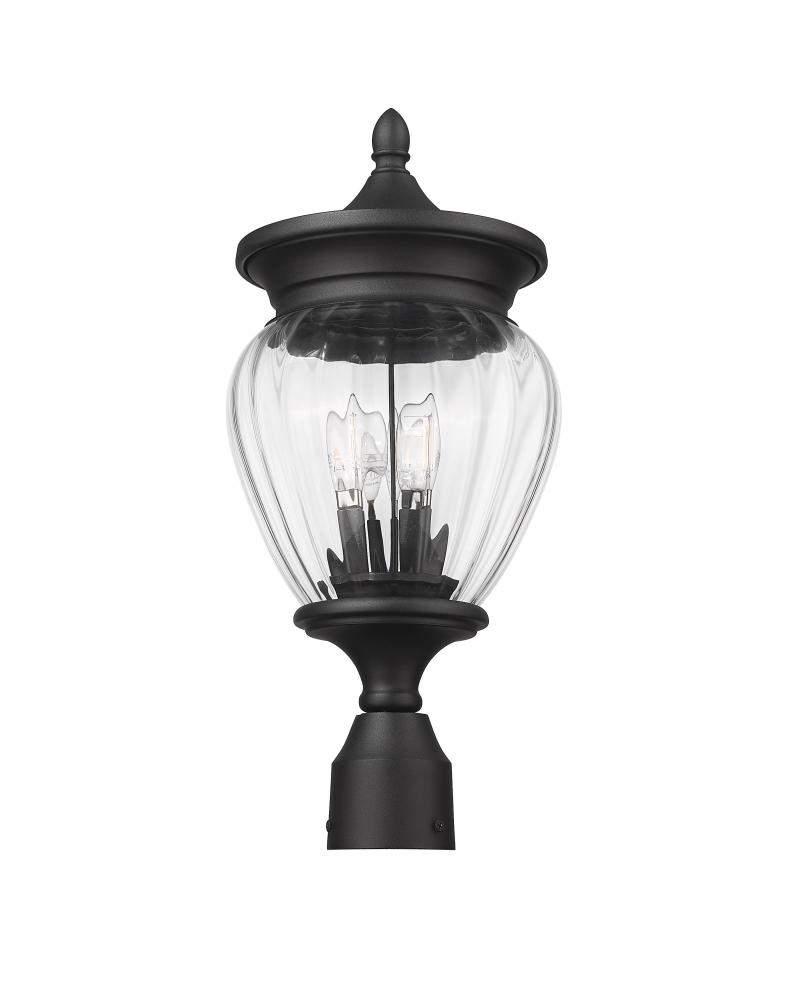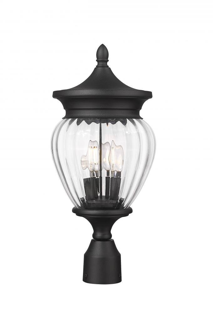 Extraordinary artistry fashions a glam look that delights in gardens and walkways. This modern three-light outdoor post mount fixture and its Coastal black paint finish aluminum construction join clear ribbed glass and are dressed up with ornate accents that bring romantic charm. A candelabra bulb mount illuminates through the textural glass to create inviting dimensionality.