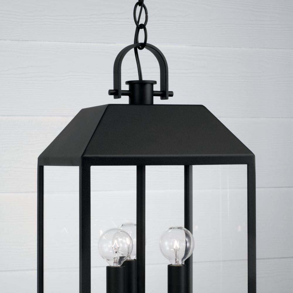 The Nelson Hanging Lantern seamlessly blends modern style with traditional details. The clear glass panes are framed by the rectangular forms for a distinct aesthetic, rounded out with the arched ring and knob on top, all in our signature Black finish. Part of our Rain or Shine Series and backed by our five-year warranty.