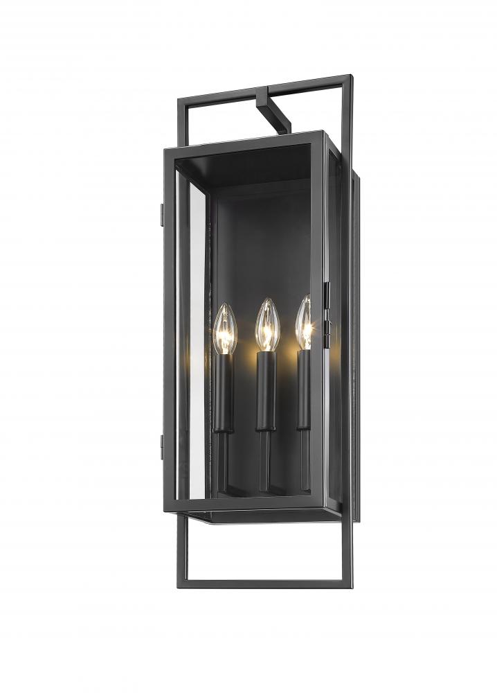 With a noticeable nod to contemporary style, this energetic exterior fixture offers a superb complement to updated spaces. The Lucian three-light outdoor wall sconce builds on a box-inspired base with an extra open base, showcasing an alignment of three candelabra style bulbs. Clear glass serves as an unobtrusive shield protecting bulbs, as bold black finish steel construction delivers a commanding presence.