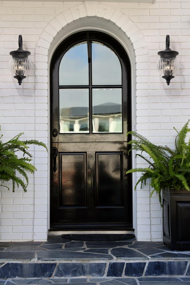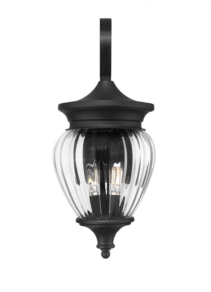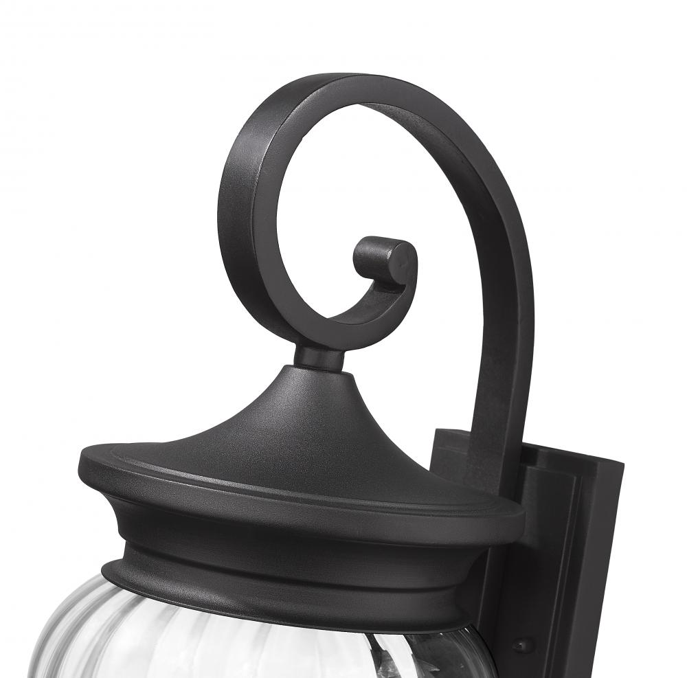 Make a point in a glam outdoor setting with this three-light outdoor wall light thats sure to make an impact. Its shapely clear ribbed glass shade settles in Coastal black paint finish aluminum framing, offering decadent influence to your exterior. Ornate accents are complemented with dimming features that make this a must-have fixture on patios, porches, and other exterior walls.