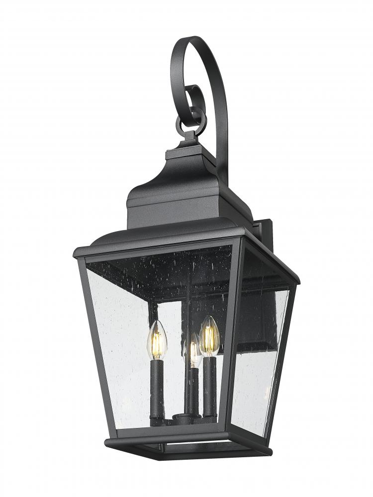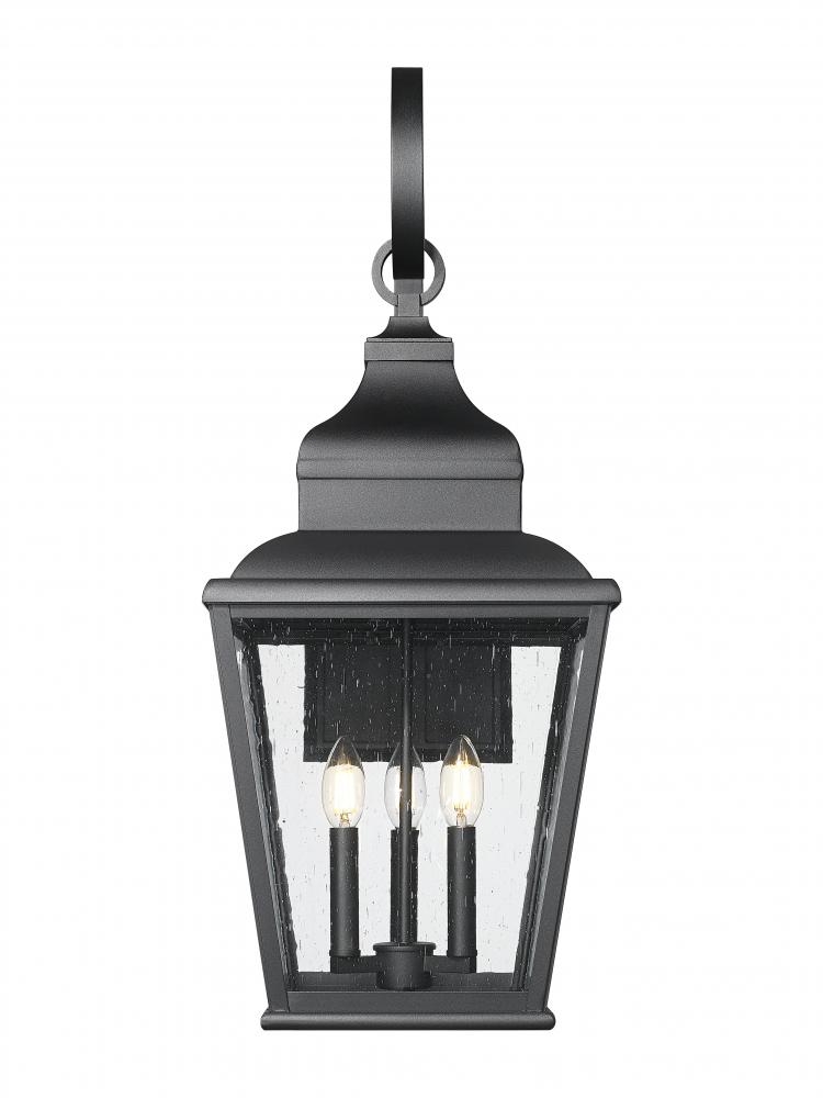 Embellished with ornate detail, this three-light outdoor light offers a classic look of decorative attitude, ideal for creating chic outdoor porches, decks, and outbuildings. Sand black finish aluminum construction delivers a lantern-like frame, tapered and dressed up with stylish detail, and clear seedy glass panels offering a mystical quality. Dimming features are especially useful in exterior settings, adjusting to time-of-day needs.