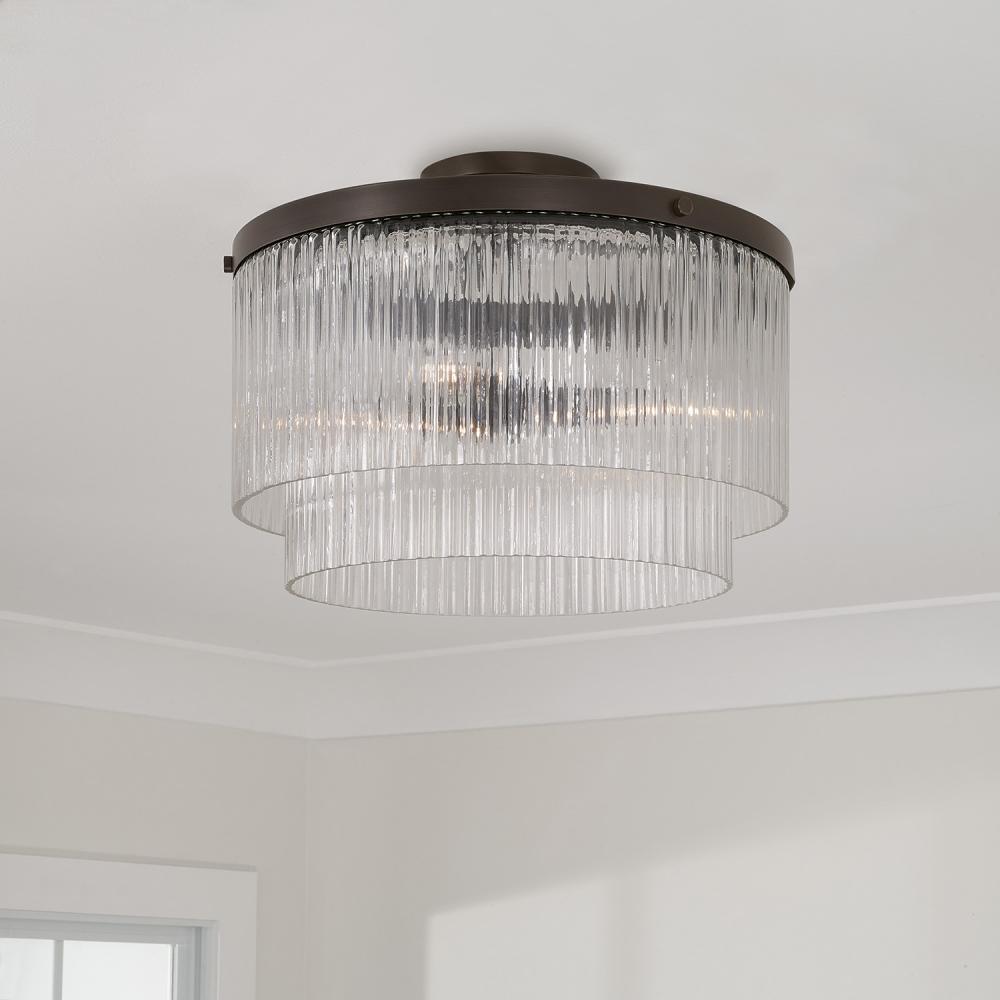 Invite stunning illumination to any space with the Vaughn Dual Mount Pendant or Semi-Flush. Whether hung as a pendant or semi flush, the Beveled Fluted glass creates captivating texture against the tiered cylindrical silhouette, while the Oil Rubbed Bronze finish offers a refined, timeless aesthetic.