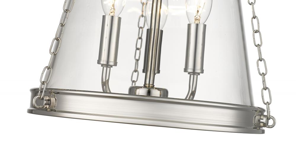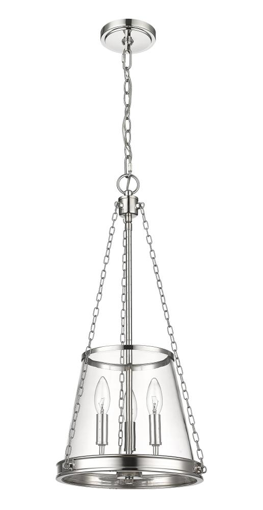 This petite three-light pendant creates a breathtaking urban touch to kitchen islands and foyers. A modern take on classical design, a charming three-arm candelabra style light rests inside a clear glass shade that elegantly tapers toward the top, transitioning into industrial style chain link supports. Lending a contemporary feel to this transitional three-light pendant is a lustrous polished nickel finish that boasts a chic, glamorous metallic element.