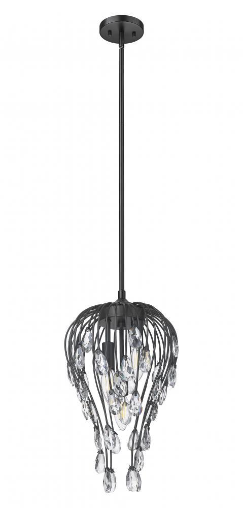 An elegant silhouette showcases open metalwork with a bold matte black finish, softening the organic botanic personality of this three-light pendant light. Bring illumination to smaller settings with a glam fixture and its contoured shape and slender metal rods culminating in sparkling crystal elements. Dining spaces, entryways, bedrooms, and living rooms come to life with this artisan-inspired dimmable pendant.