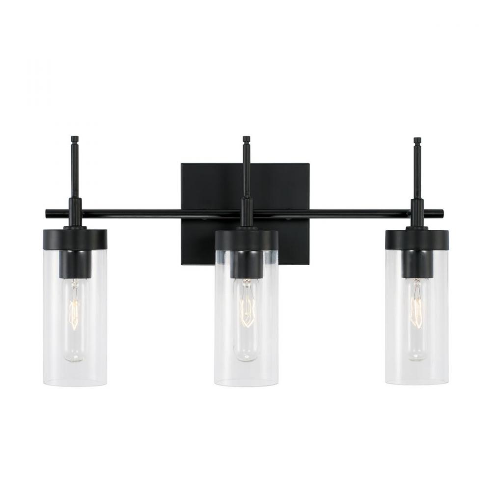 Bring modern style to any bathroom or powder room with the Riley Vanity. The elongated lines and Matte Black finish perfectly complement the clear cylindrical glass.