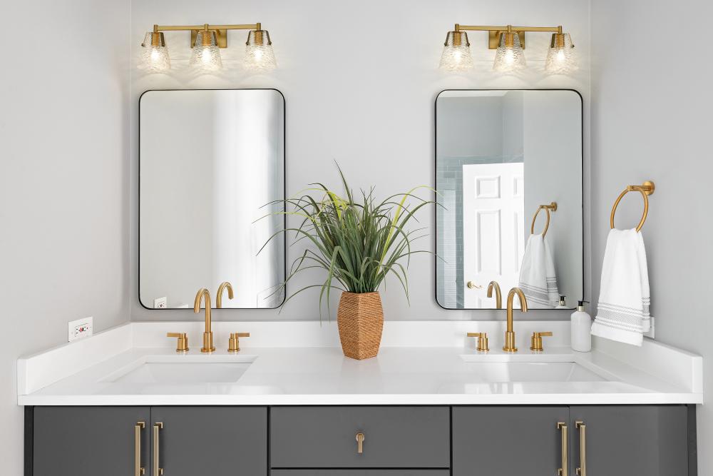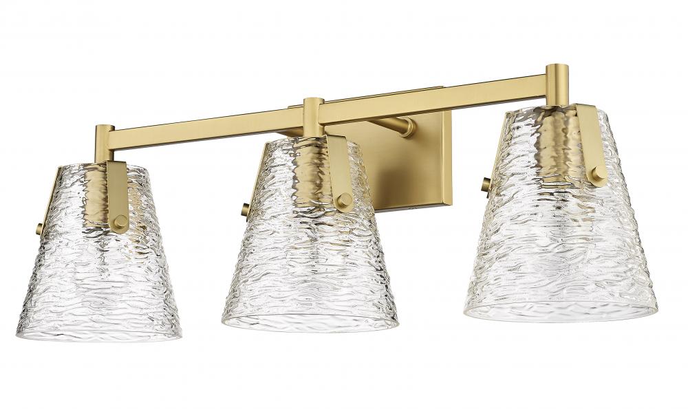 Make elegance and ambient lighting a key element in an ensuite or guest bath with this chic three-light vanity bath light. Crowning a custom vanity, this fixture from the Analia collection brings a bit of nautical charm with a trio of conical shades fashioned of clear textured glass and a modern gold finish steel frame. Choose this three-light vanity light to dress up a contemporary or transitional ensuite or guest bath.