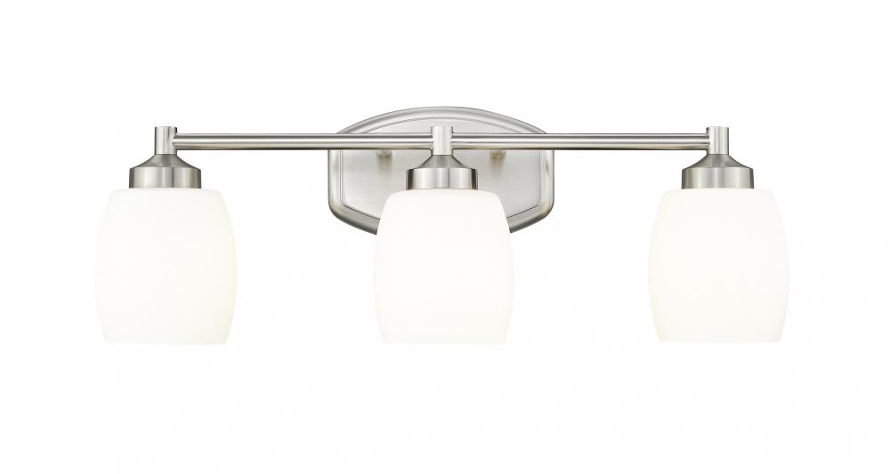 Introduce soothing style and bright illumination with a stylishly understated modern three-light vanity fixture. Its fresh curvature creates a compelling profile, enhanced with a brushed nickel finish for a refined touch. Matte opal glass shades echo the curvature of the wall plate, while delivering inviting illumination for beauty and grooming tasks.