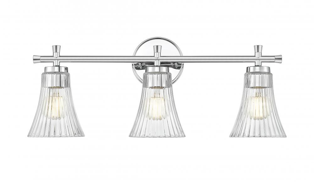 Chrome adds a mirror-like brilliance to this three-light vanity fixture, giving it a crisp, polished presence. Fluted clear glass shades catch the light with elegance, reflecting subtle sparkle across the room. It?s a sleek and graceful update that turns daily routines into radiant rituals.