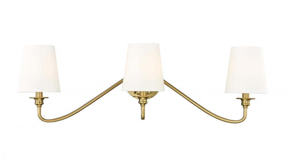 Create a rich, welcoming ambiance in a family room or foyer with a modern three-light wall sconce. Designed for impeccable, refined style, it features a trio of curvy arms emerging from a compact round wall plate, all in a warm modern gold finish that creates a sense of distinction. Three opaque white shades add a modern empire silhouette, perfect for a variety of spaces.