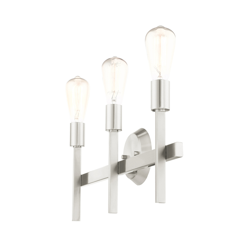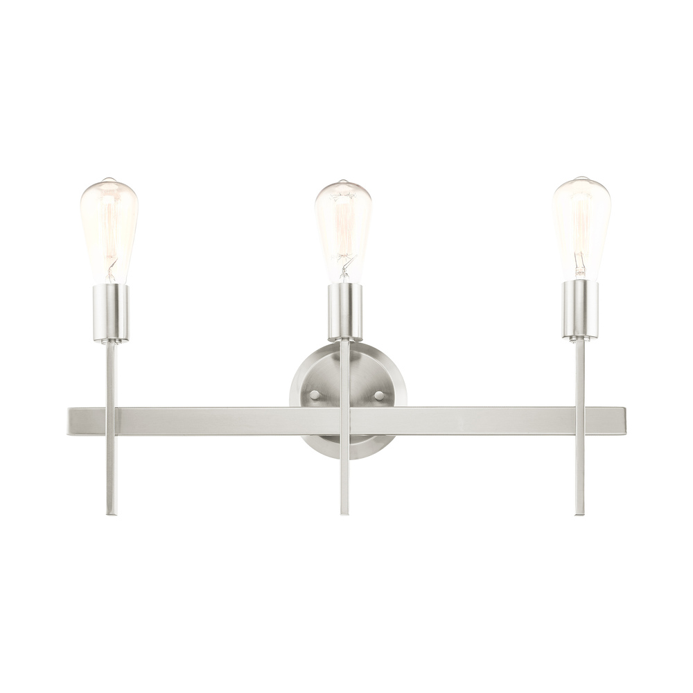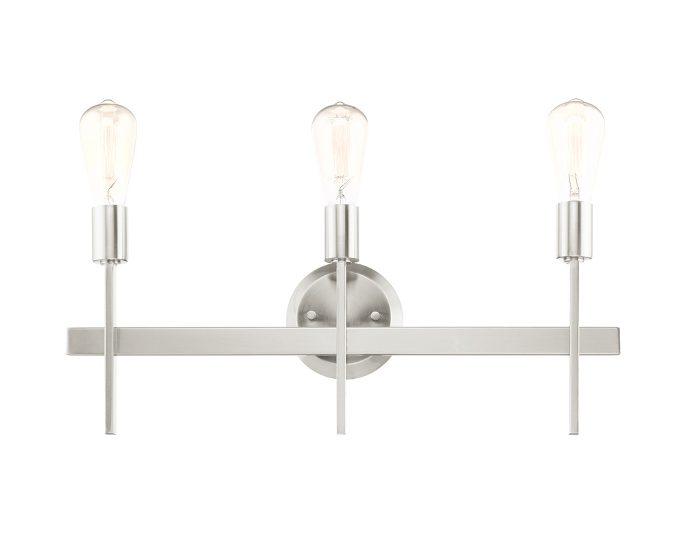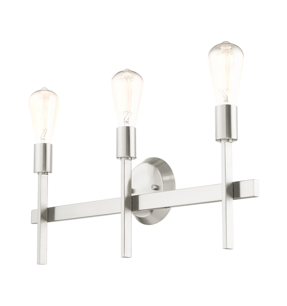 Clean lines and exposed bulb sockets make the Prague collection?perfect for your mid-mod or transitional bath. The eclectic look is perfect for spaces wanting an urban, minimalistic or industrial touch. With superb craftsmanship and affordable price, this brushed nickel three-light vanity sconce is sure to tastefully indulge your extravagant side.