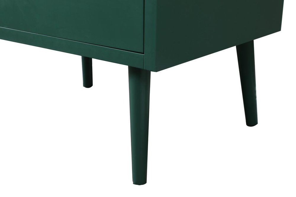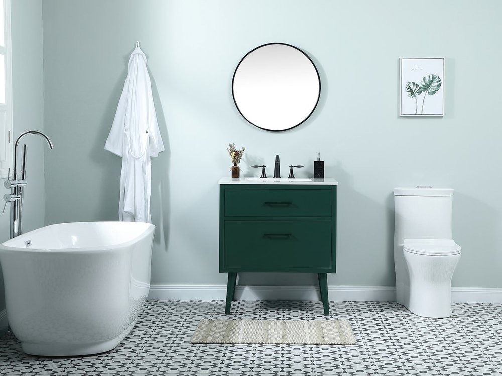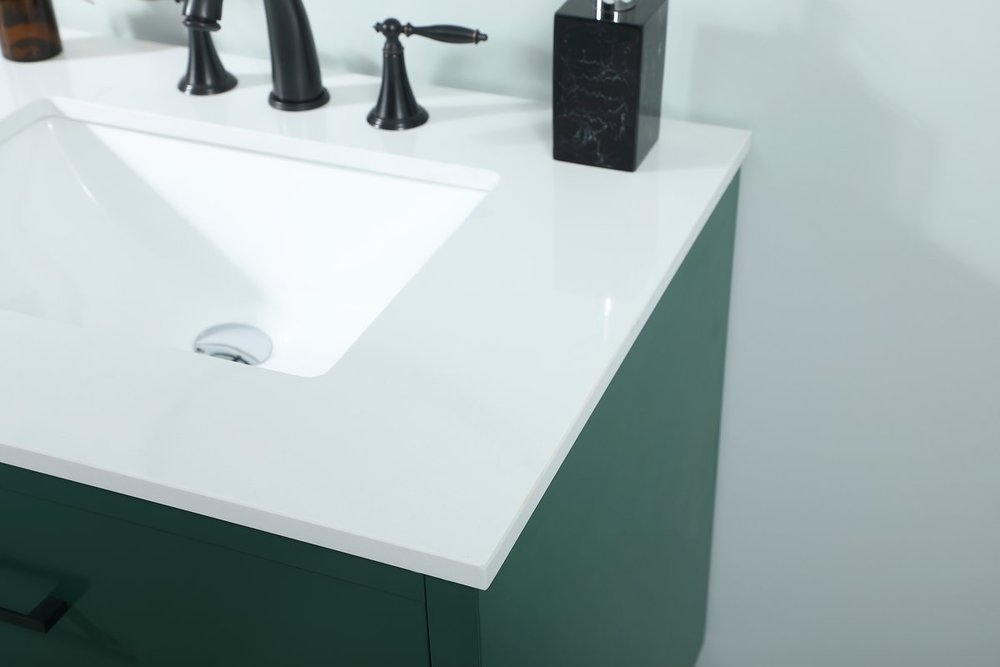 Delve into a world of minimalistic fashion and contemporary styling with this midcentury modern 30" vanity. The clean lines anchors the design, while the oblique tapered cylinder legs add subtle interest. However, the artful juxtaposition between the green and white top creates a blend of bright modernity and classical traditions. A black handle adorns the top fake drawer hiding the base of the undermount porcelain sink while another one allows you to pull the bottom drawer out, letting you store your bathroom necessities and toiletries. The compact size makes it the perfect vanity for any bathroom or powder room, regardless of size.