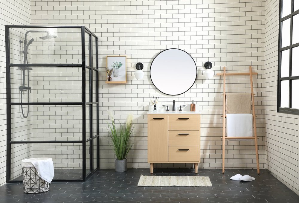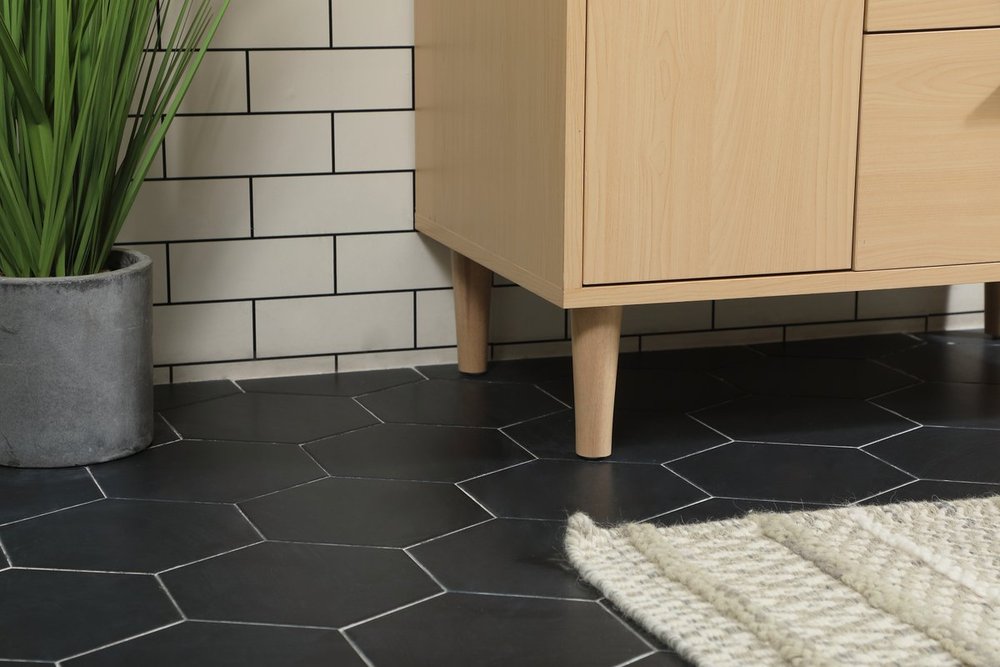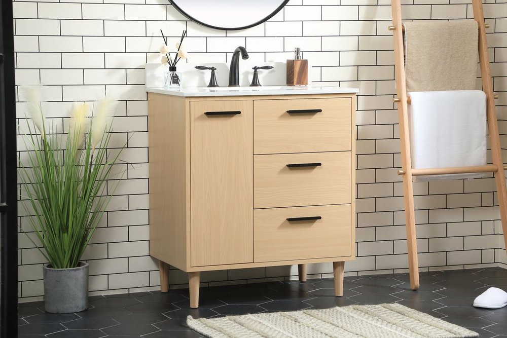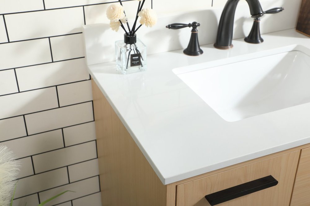 Modern sophistication is defined with the mape finish and black barpulls of this vanity and slender tapered legs. Its length makes it the perfect addition to any sized home, and saves space with its storage area hidden behind the Single cabinet door and two bottom drawers. Topped with a highly durable engineered stone countertop and a porcelain undermount sink, this modern design will become your focal point of your bathroom or powder room. Comes with a matching backsplash to complete the look and protects your wall. Equipped with soft-closing drawer and doors adds a quiet functional touch.