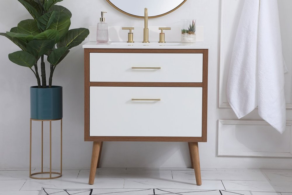 Delve into a world of minimalistic fashion and contemporary styling with this midcentury modern 30" vanity. The clean lines anchors the design, while the oblique tapered cylinder legs add subtle interest. However, the artful juxtaposition between the walnut brown and matte white creates a blend of bright modernity and classical traditions. A gold handle adorns the top fake drawer hiding the base of the undermount porcelain sink while another one allows you to pull the bottom drawer out, letting you store your bathroom necessities and toiletries. The compact size makes it the perfect vanity for any bathroom or powder room, regardless of size. Comes with a matching backsplash to complete the look and protects your wall.