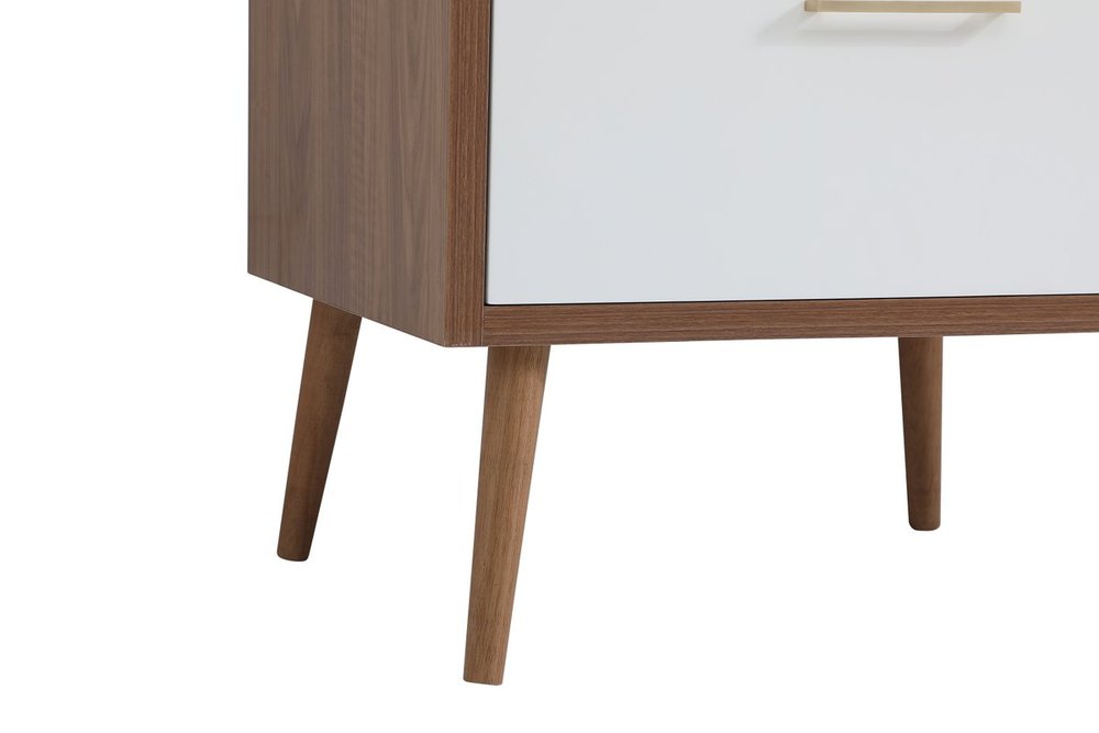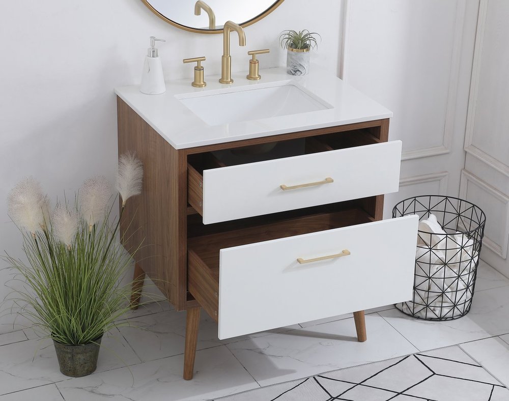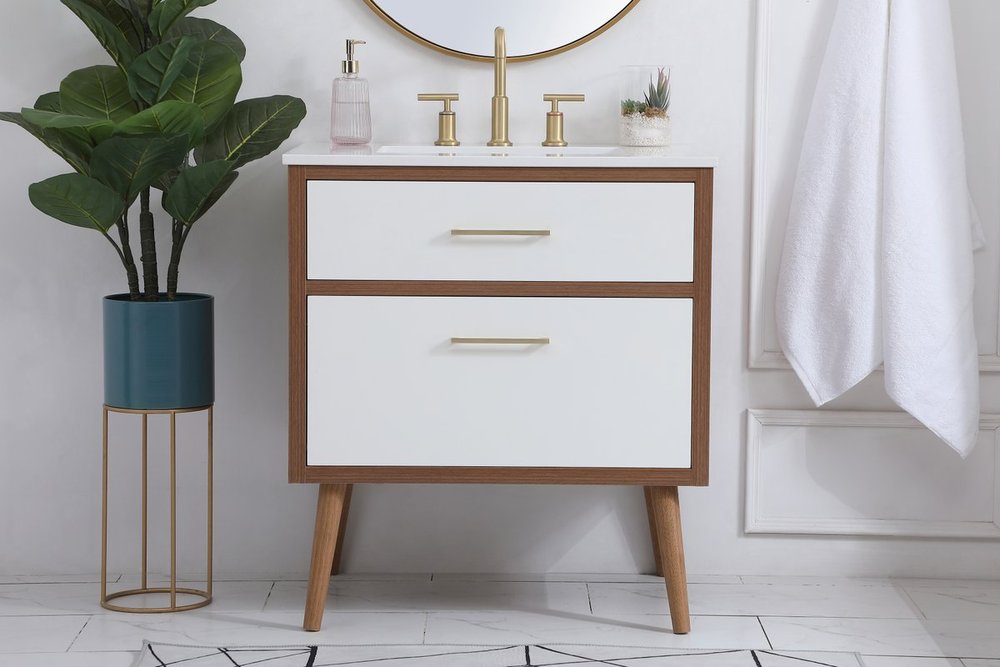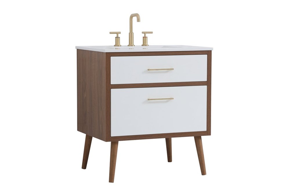 Delve into a world of minimalistic fashion and contemporary styling with this midcentury modern 30" vanity. The clean lines anchors the design, while the oblique tapered cylinder legs add subtle interest. However, the artful juxtaposition between the walnut brown and matte white creates a blend of bright modernity and classical traditions. A gold handle adorns the top fake drawer hiding the base of the undermount porcelain sink while another one allows you to pull the bottom drawer out, letting you store your bathroom necessities and toiletries. The compact size makes it the perfect vanity for any bathroom or powder room, regardless of size.