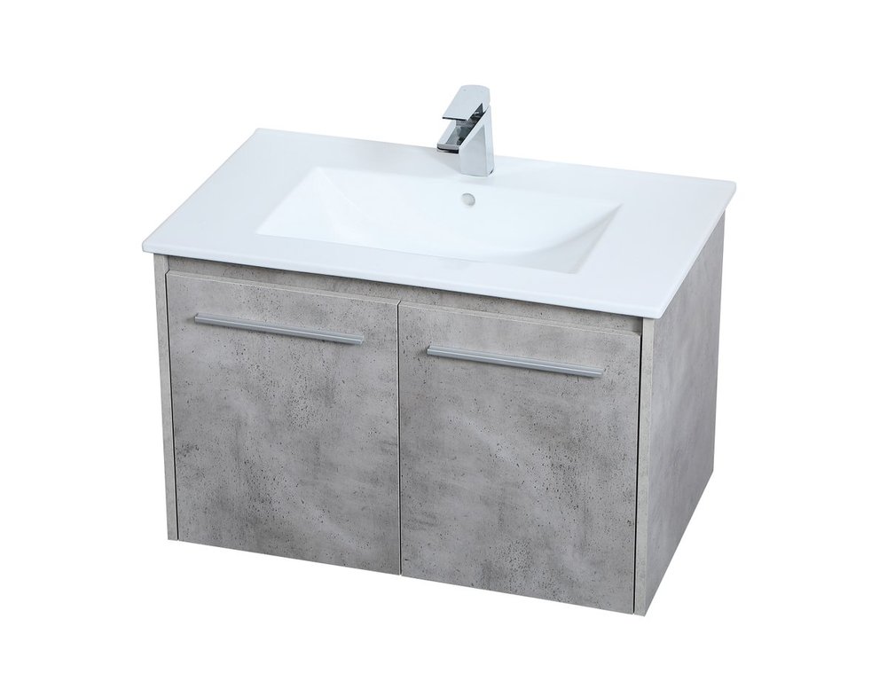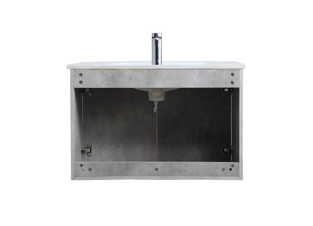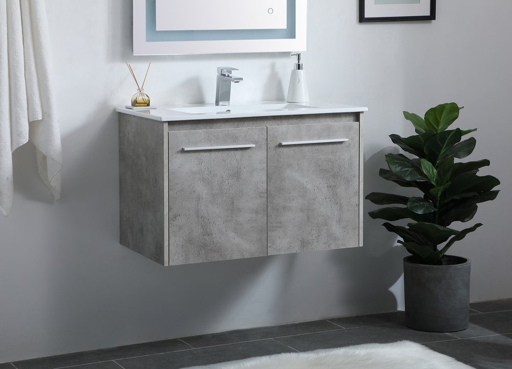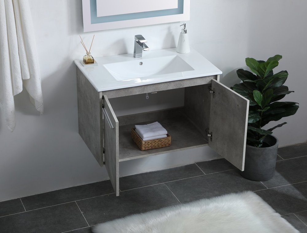 The contemporary simplicity of this 30" floating vanity in a concrete grey finish will help open the space and add stunning modern flair to your bathroom or powder room. The open space below makes it easy to show off your tiles and to clean the floor with ease--it's also the perfect place for a hamper. Double doors open to reveal plentiful of storage pace to store all of your bathroom miscellany. The clean lines that permeate through the design will surely create a fresh look in your home.