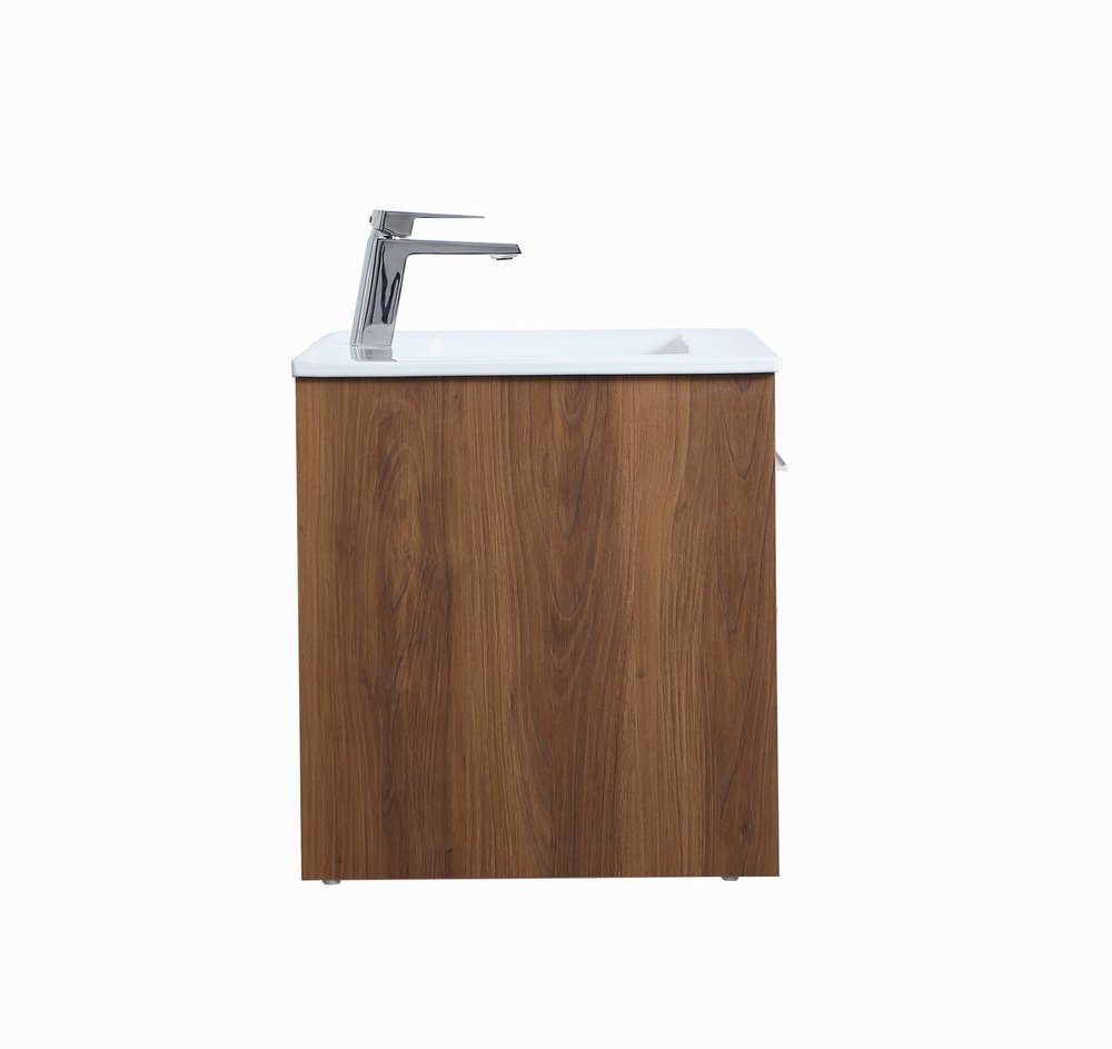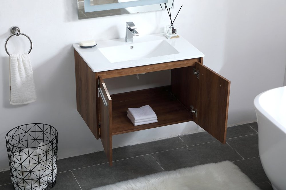 The contemporary simplicity of this 30" floating vanity in a walnut brown finish will help open the space and add stunning modern flair to your bathroom or powder room. The open space below makes it easy to show off your tiles and to clean the floor with ease--it's also the perfect place for a hamper. Double doors open to reveal plentiful of storage pace to store all of your bathroom miscellany. The clean lines that permeate through the design will surely create a fresh look in your home.