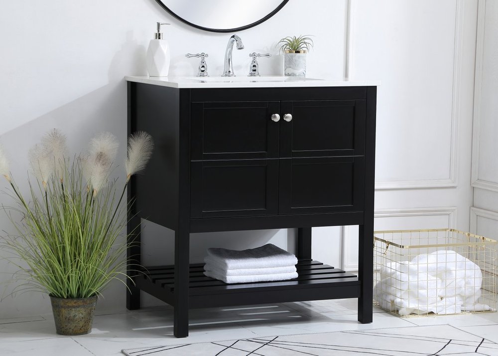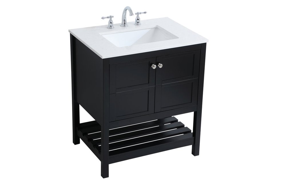 The subtle beauty of the Theo collection 30" vanity in a black finish exudes comfortable luxury. Its modern, yet traditional beauty will surely dress up your bathroom or powder room without any fuss. The white stone countertop and porcelain undermount sink shows quiet opulence, and the legs support upright without fail. Brushed Nickel hardware complements the trendy black finish, with pulls adorning the two cabinet doors, showcasing ample storage space within. Slated shelf allows for additional space to organize your towels. Whether this vanity is in your bathroom or for guests, its presence will surely elevate the aesthetics of your room.