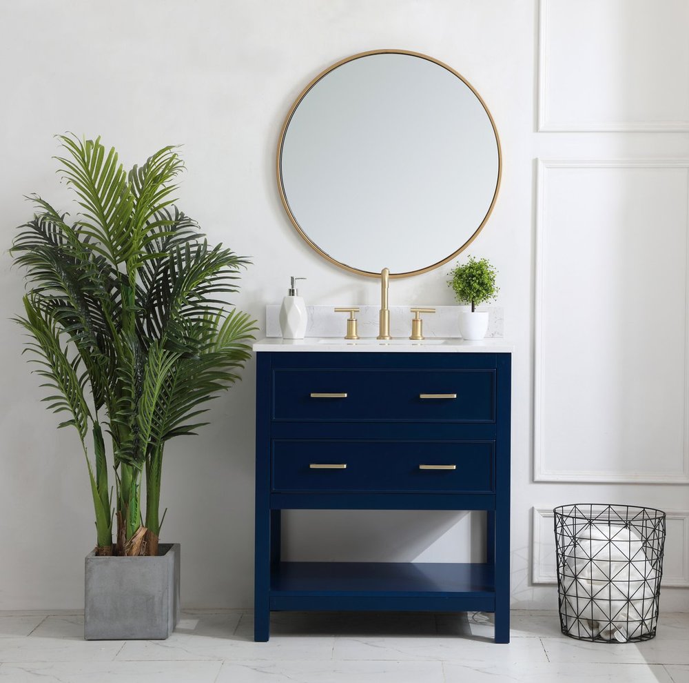Make the most of your space with this 30" traditional style bathroom vanity. Its traditional style is able to complement many aesthetics with its blue finish, Calacatta engineered marble countertop, and the contemporary slender gold finish handle bar that sits on the two u-shaped drawers, allowing you to store an assortment of bathroom essentials. The lower shelf makes it the perfect space to hold new towels for your guests. This compact vanity ensures both form and function in your bathroom or powder room for you and your guests. Comes with a matching backsplash to complete the look and protects your wall.