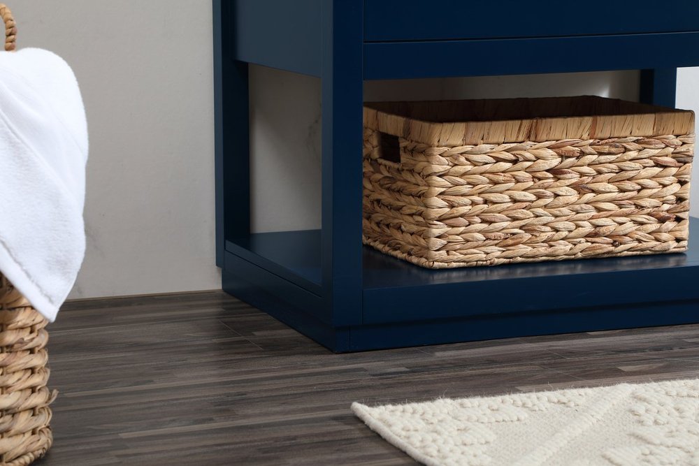 Live in modern comfort with this 30" blue finish vanity. Dressed in a blue and sleek gold metal hardware, its contemporary style will have your bathroom or powder room elevated in modern sophistication. The open shelf at the base and two drawers reveal ample storage space for your bathroom essentials and miscellany. Clean lines create its own visual interest, adding trendy looks to your already chic room. Comes with a matching backsplash to protect your walls.