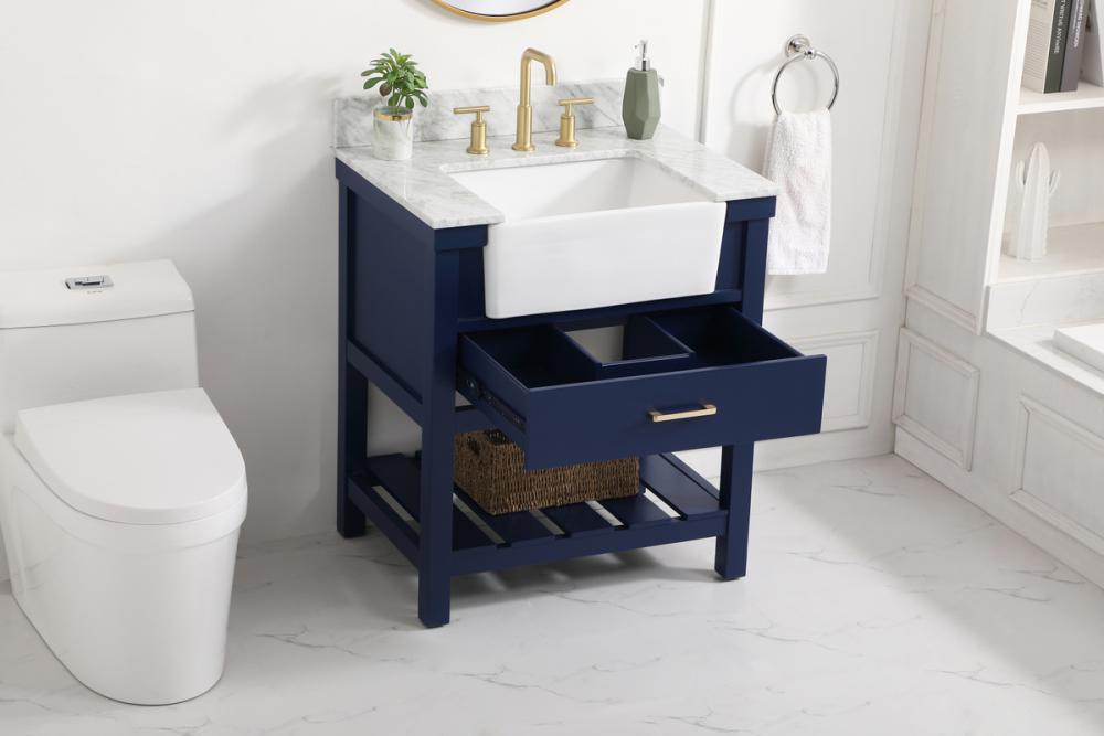 Make the most of your space with this farmhouse style bathroom vanity. Complements well with its beautiful finish, carrara white marble countertop, and the contemporary slender handle bar that sits on the functional drawers with soft closing mechanism, allowing you to store an assortment of bathroom essentials. The lower shelf makes it the perfect space to hold new towels for your guests. This stylish vanity ensures both form and function in your bathroom for you and your guests. Comes with a matching backsplash to complete the look and protects your wall.