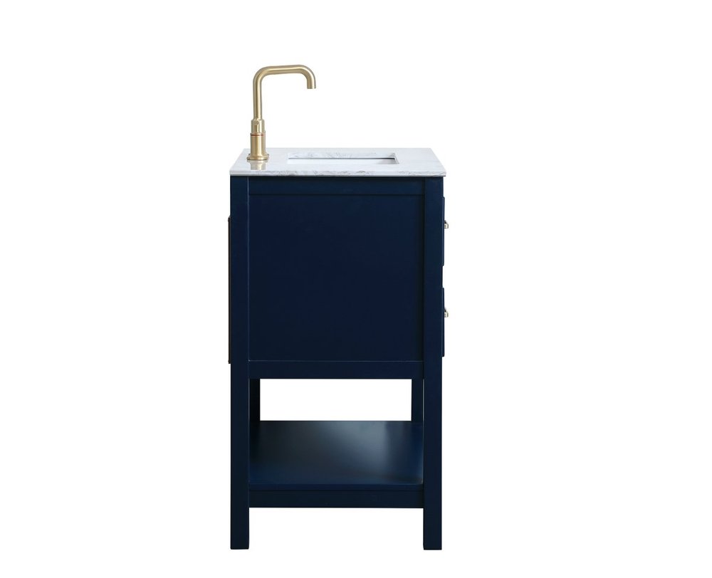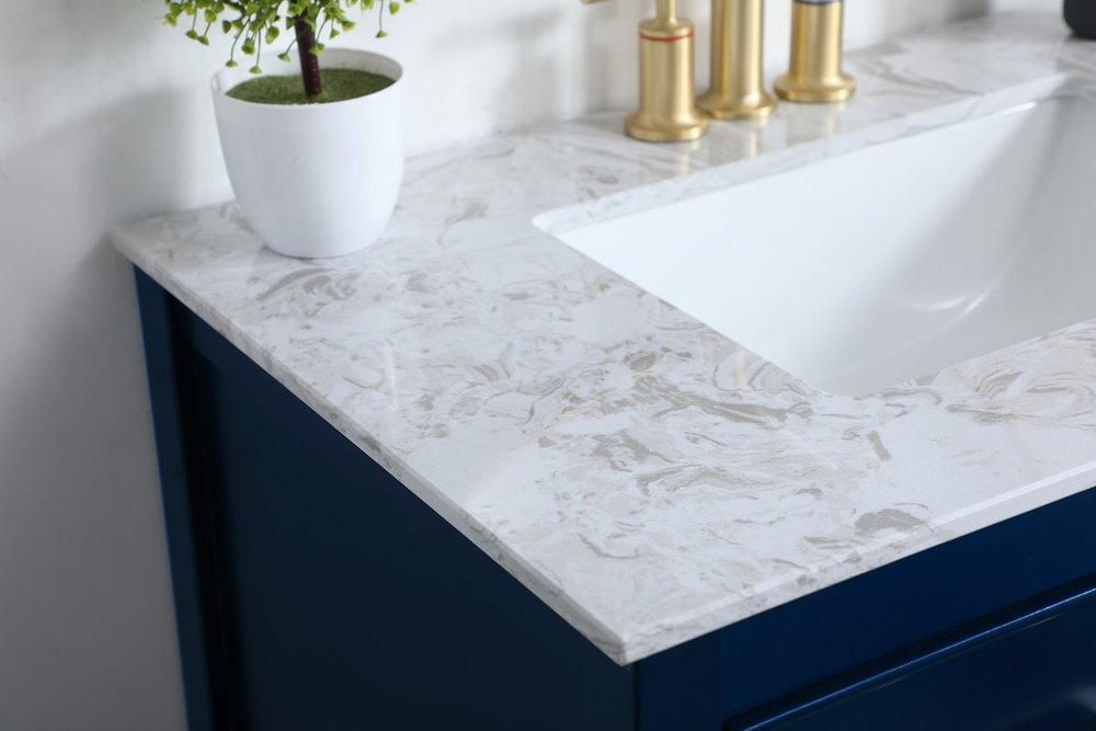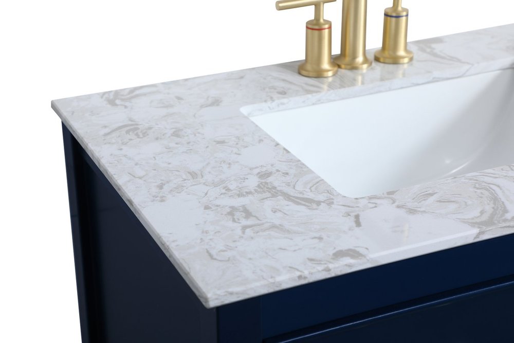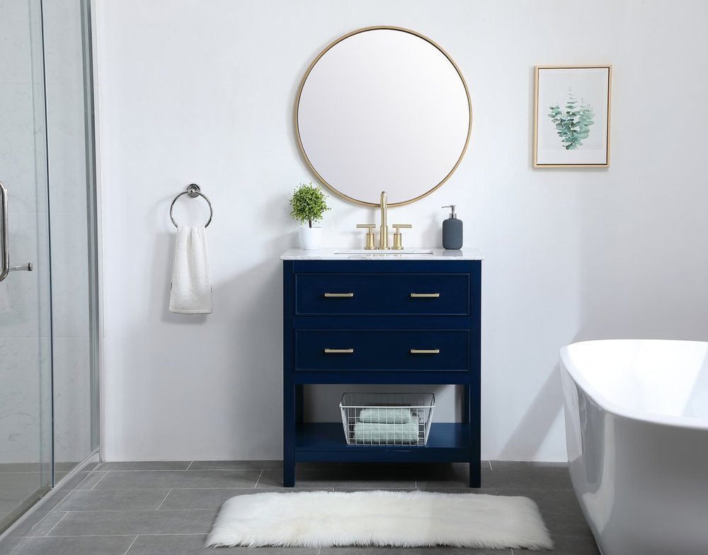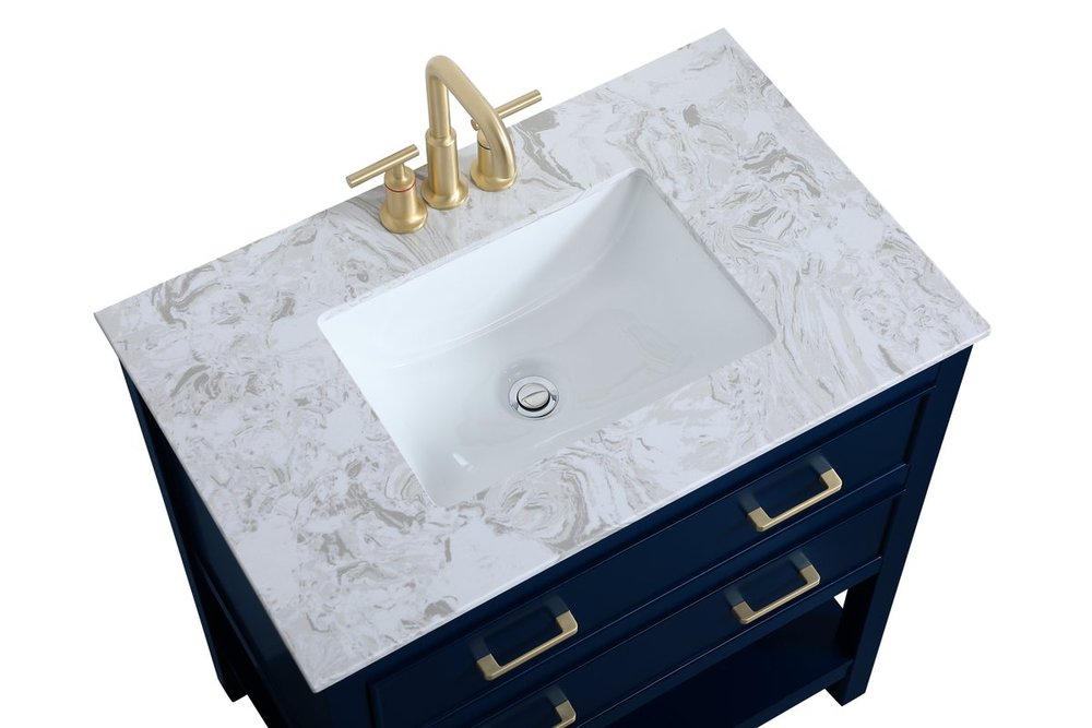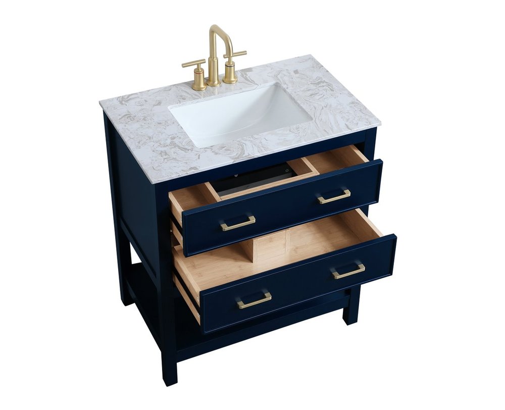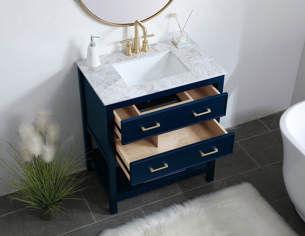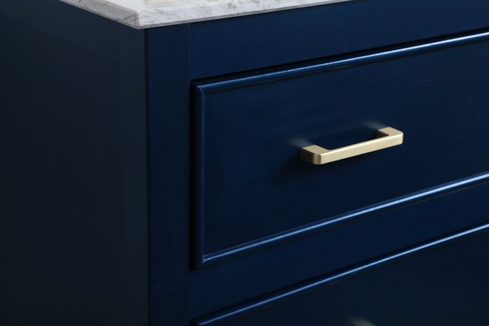 Elegance and sophistication go hand-in-hand with this stunning vanity 30" vanity. The rich blue finish is beautifully complimented by the dazzling brushed gold hardware. The two drawers extend out to reveal U-drawers--perfect for storing away any bathroom toiletries, and the exposed shelf at the base allows for more storage space. Create an aura of refined taste in your bathroom or powder room.