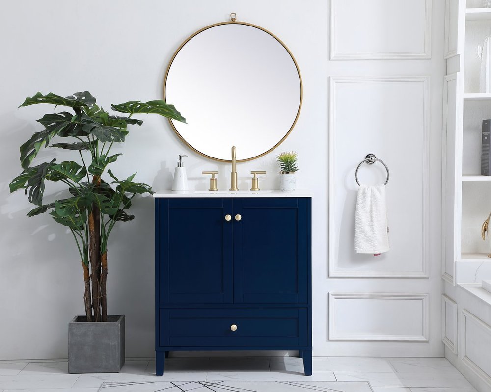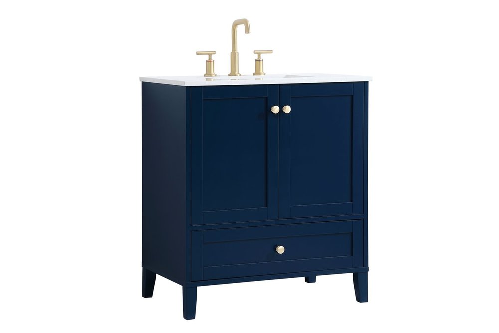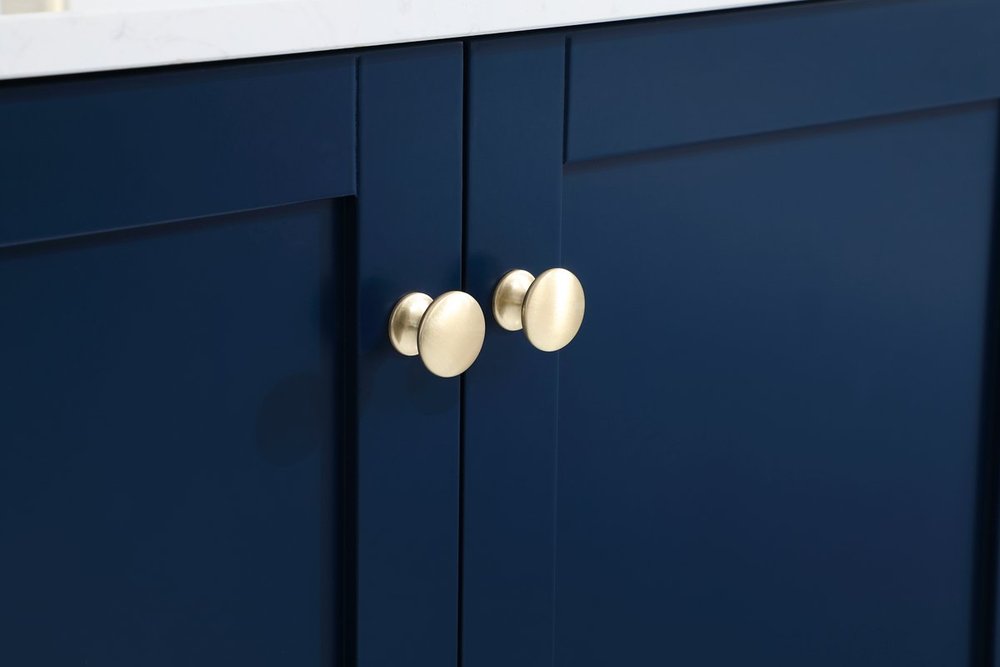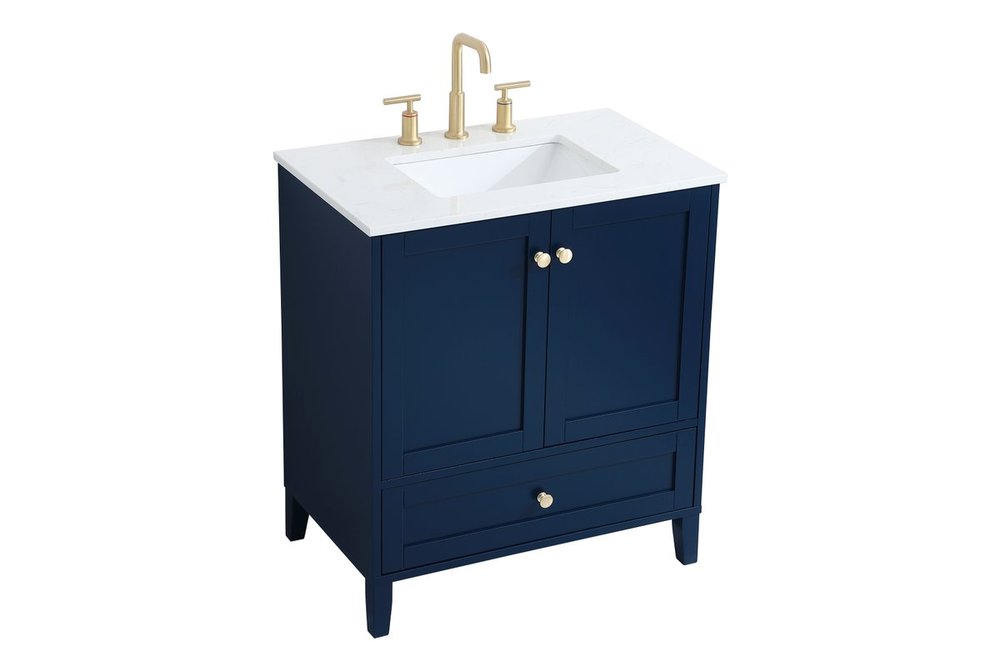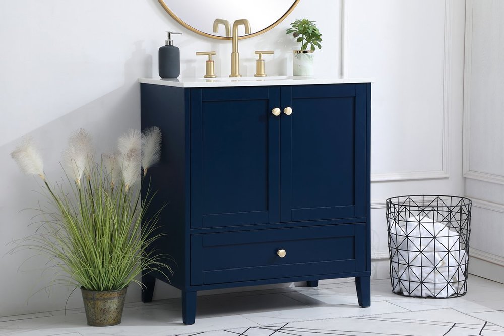 While unassuming, this 30" vanity in a Blue finish sure knows how to redefine luxury. The sleek gold knobs adorn the two cabinet doors and base drawer which allows you to store your bathroom toiletries and necessities. Standing strong on oblique legs and dressed with a calacatta engineered marble countertop, this vanity will surely create beauty and casual elegance in your bathroom or powder room.