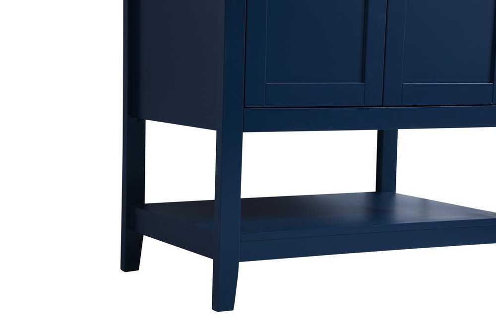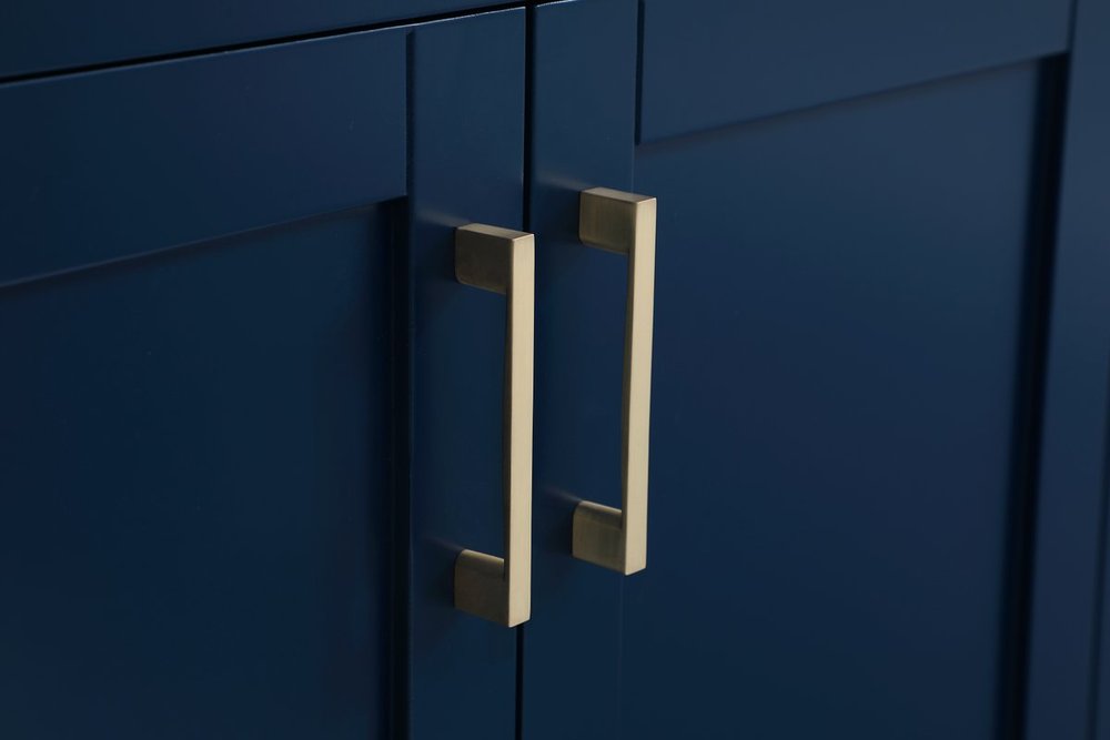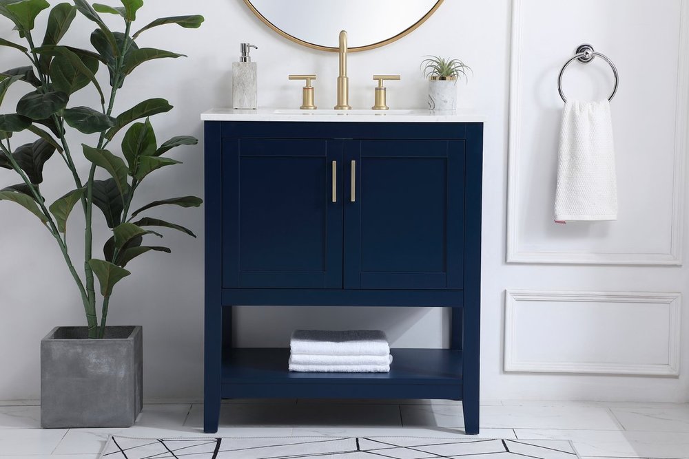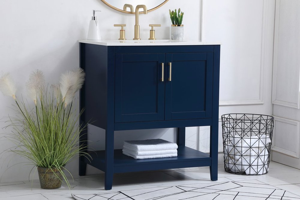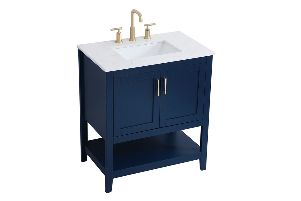 The nonchalant attitude of this 30" traditional Blue finish vanity will have you wanting more. The slender gold handle bars open the two cabinet doors to reveal ample storage space to put away and store bathroom essentials, and the open space below allows for you to place clean towels on the rack. Topped with a Calacatta engineered marble countertop, you and your guests will enjoy this easy going vanity.