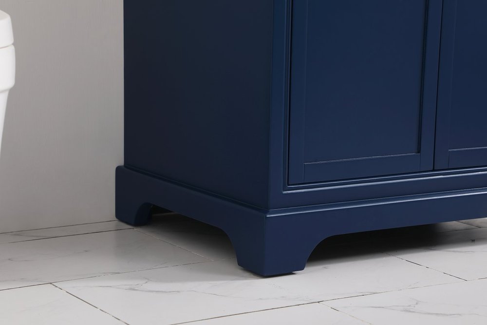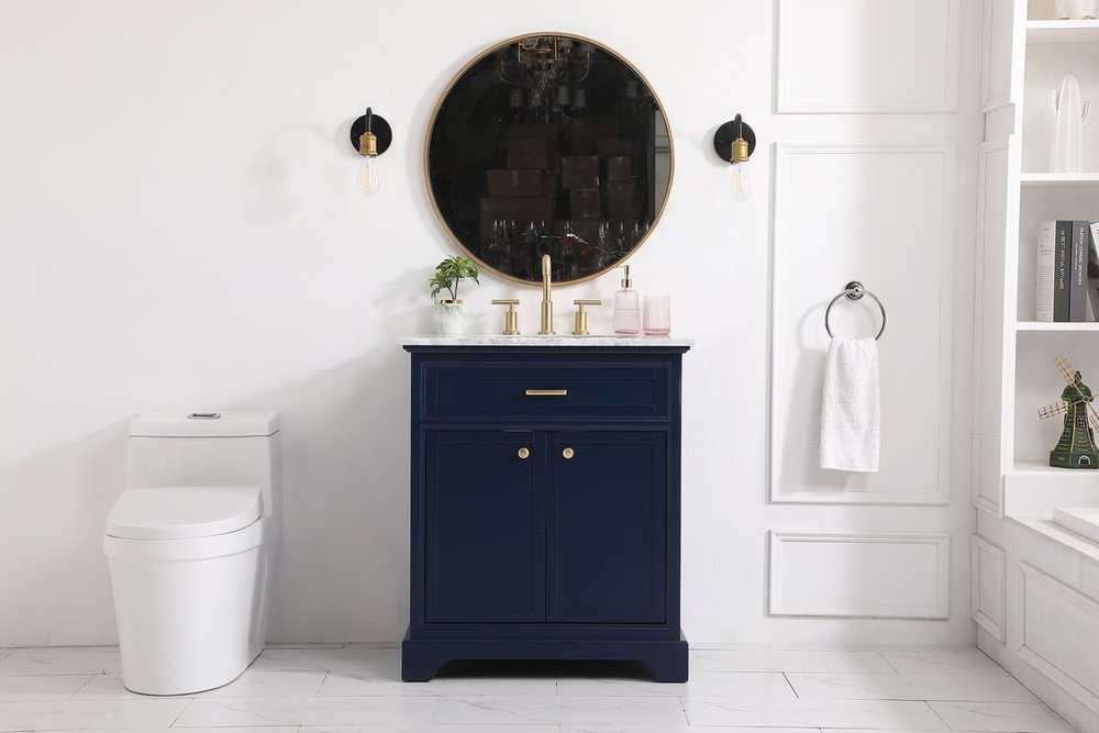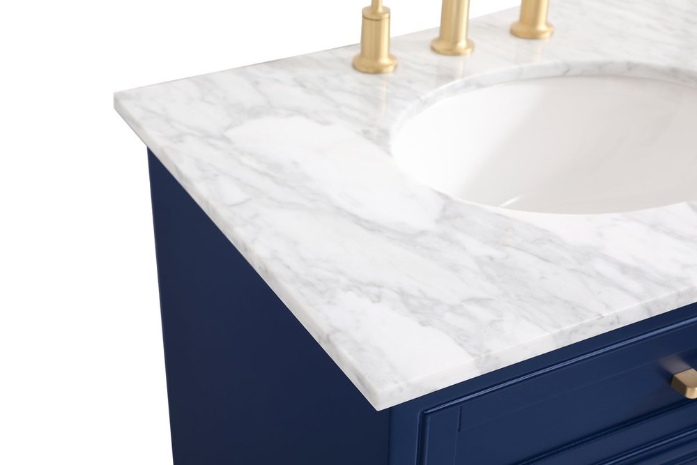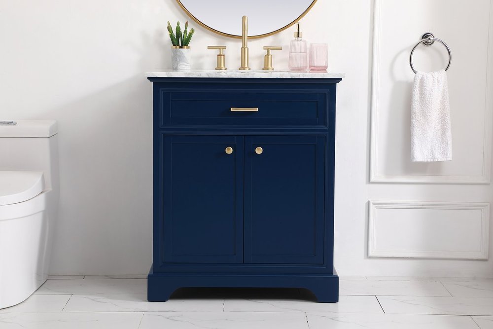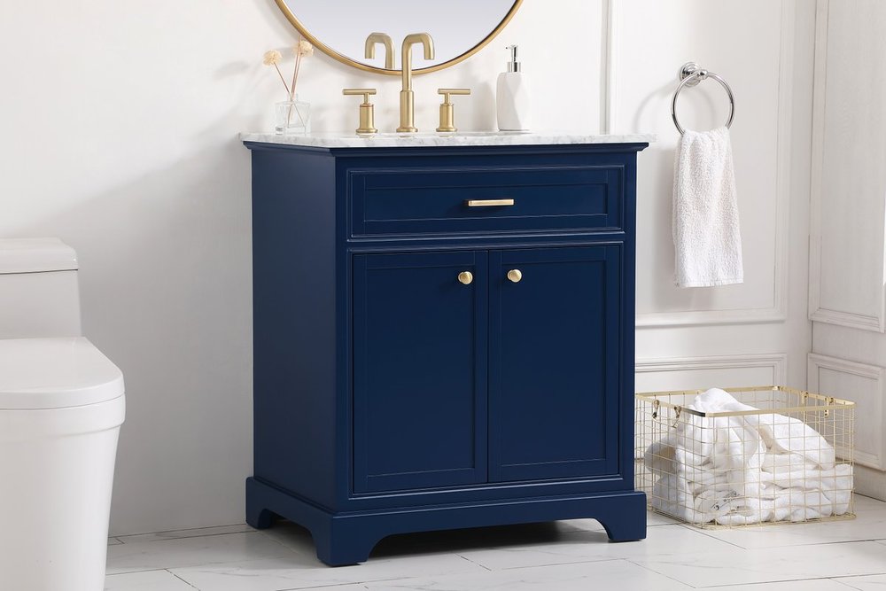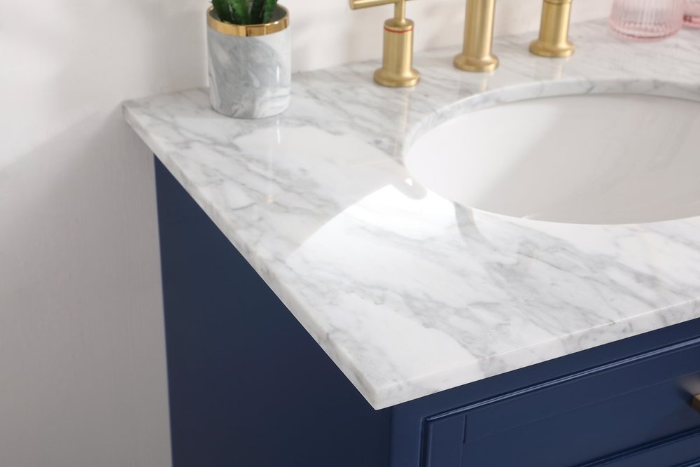 From its Italian Carrara white marble top to its contemporary-styled hand painted blue cabinet, this member of our “Americana” vanity collection is sure to enhance either your home or office bathroom. Beneath its lustrous, natural marble top and an oval, white porcelain under mount sink, a handsome 2-door cabinet with a Single shelf for all your bathroom essentials, highlighted with recessed panel doors, brushed gold bar handle and knobs, stands on strong solid pedestal feet. A wonderful balance of simplicity and practical function! Measurements: W30”xD21.5”xH35”