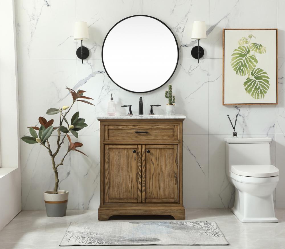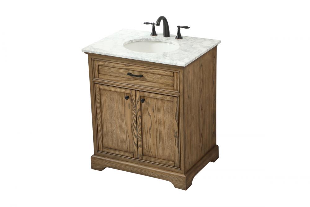 Comes with an undermount porcelain sink and a carrara white marble countertop