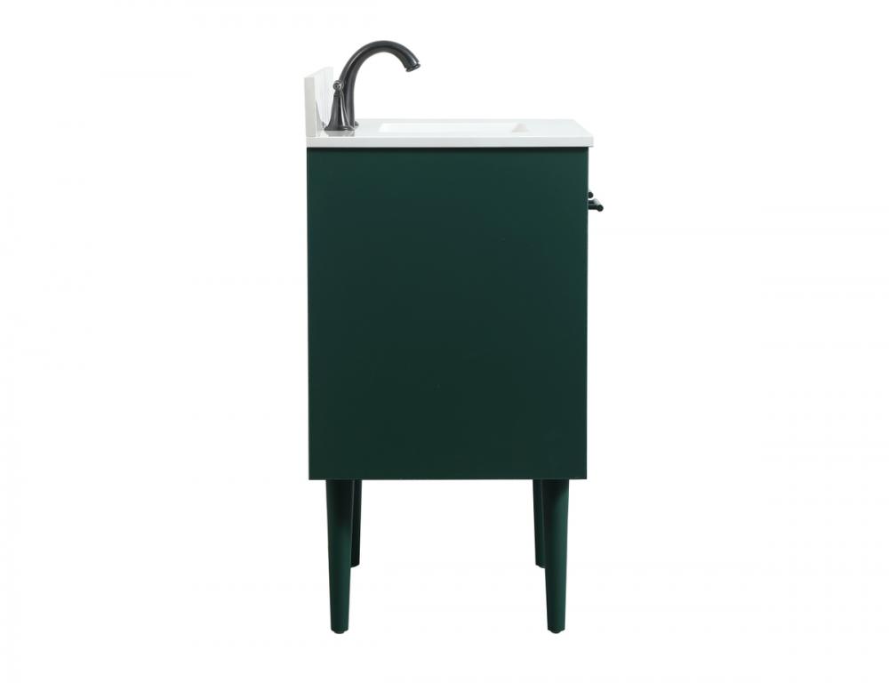 Delve into a world of minimalistic fashion and contemporary styling with this midcentury modern vanity. The clean lines anchors the design, while the straight tapered cylinder legs add subtle interest. Bar pull handle adorns the soft closing door hiding the base of the rectangular porcelain sink and letting you store your bathroom necessities and toiletries. Whether you want to use this as a floating vanity or a freestanding vanity, the choice is yours. The durable ivory white engineered marble countertop complements the manufactured wood base vanity and is built to last. Comes with a matching backsplash to complete the look and protects your wall.