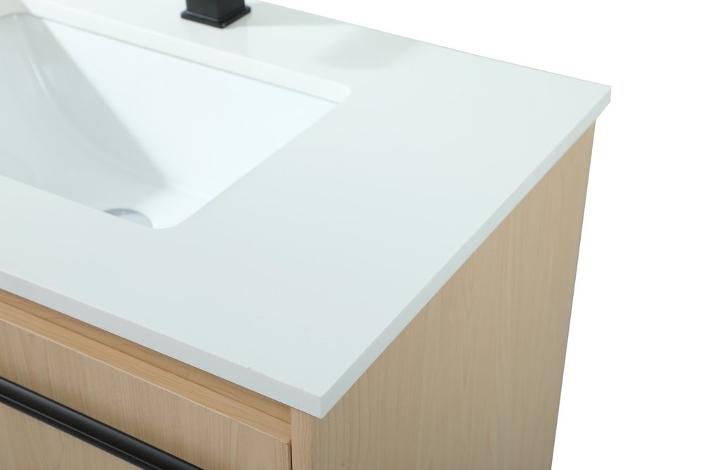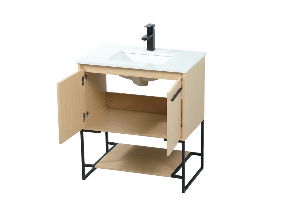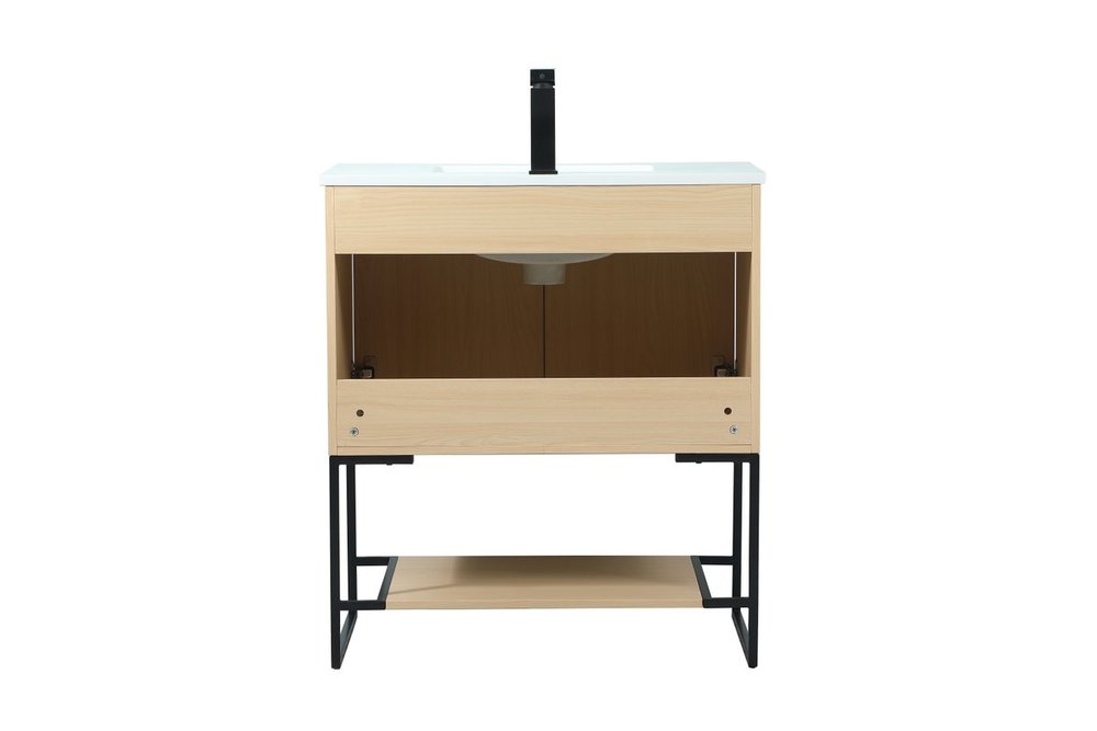 Live in modern comfort with this 30" maple finish vanity. Dressed in a maple and sleek black metal hardware, its contemporary style will have your bathroom or powder room elevated in industrial sophistication. The open shelf at the base and two doors reveal ample storage space for your bathroom essentials and miscellany. Clean lines create its own visual interest, adding trendy looks to your already chic room.