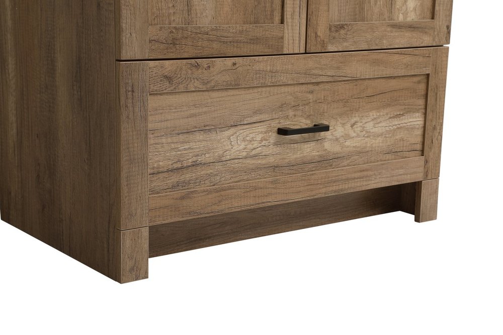 Delve into a world of minimalistic fashion and contemporary styling with this farmhouse 30" vanity. The clean faux lines anchors the weathered design. Black handle adorns the two doors hiding the base of the integrated porcelain sink while the bottom drawer allows you to store your bathroom necessities and toiletries. The compact size makes it the perfect vanity for any bathroom or powder room, regardless of size. Comes with a matching backsplash to complete the look and protects your wall.