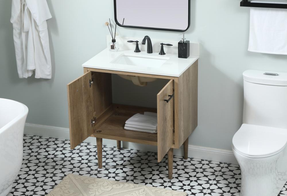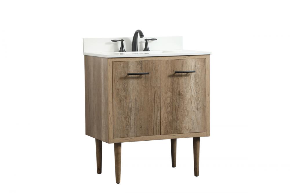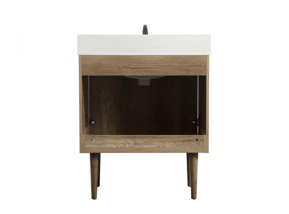 Delve into a world of minimalistic fashion and contemporary styling with this midcentury modern vanity. The clean lines anchors the design, while the straight tapered cylinder legs add subtle interest. Bar pull handle adorns the soft closing door hiding the base of the rectangular porcelain sink and letting you store your bathroom necessities and toiletries. Whether you want to use this as a floating vanity or a freestanding vanity, the choice is yours. The durable ivory white engineered marble countertop complements the manufactured wood base vanity and is built to last. Comes with a matching backsplash to complete the look and protects your wall.