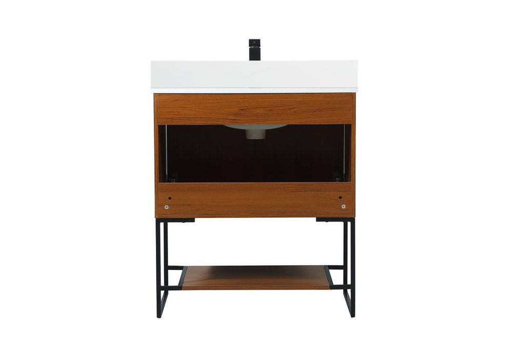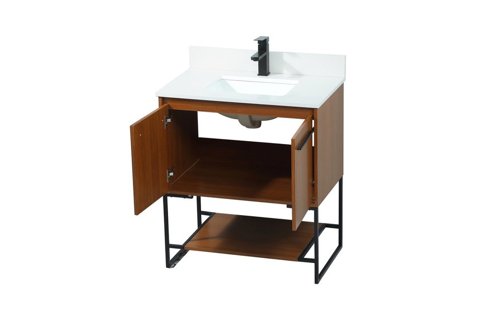Live in modern comfort with this 30" teak finish vanity. Dressed in a teak and sleek black metal hardware, its contemporary style will have your bathroom or powder room elevated in industrial sophistication. The open shelf at the base and two doors reveal ample storage space for your bathroom essentials and miscellany. Clean lines create its own visual interest, adding trendy looks to your already chic room. Comes with a matching backsplash to complete the look and protects your wall.