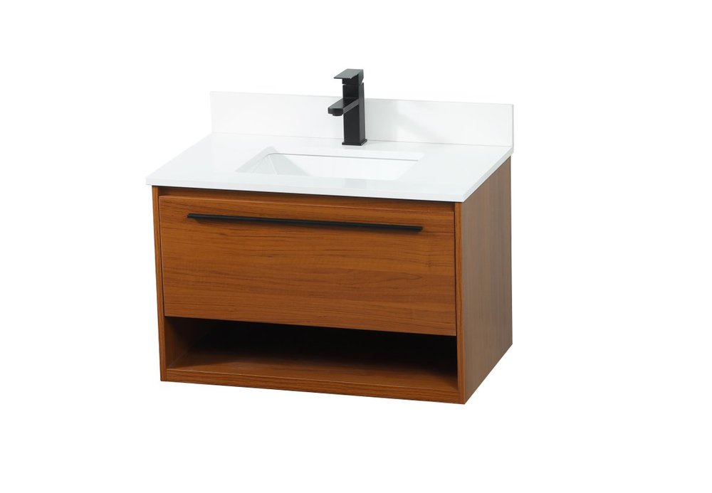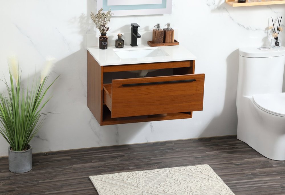 Save space and make your bathroom appear bigger with this floating vanity. Its minimal design will have you in awe, while its clean lines will leave your room feeling fresh and uncluttered. The Single u-drawer pulls out for storage while the open space below allows you to place extra towels or various other essentials. The ivory white engineered marble counter top with porcelain sink adds refined luxe while the aluminum barpull style handle adorn the vanity face. Comes with a matching backsplash to protect your walls.