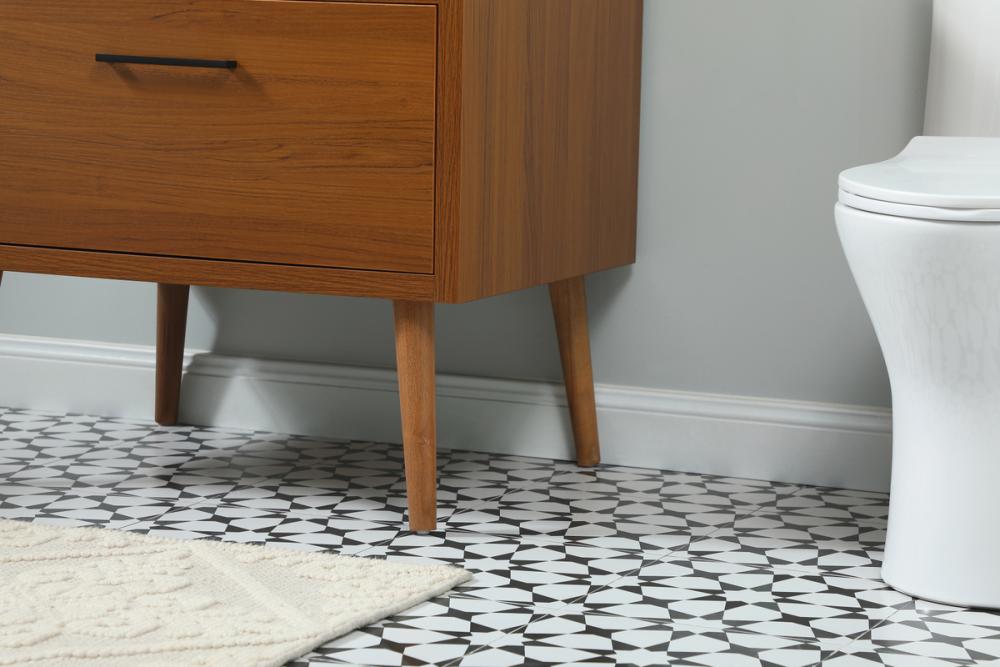 This bathroom vanity is a perfect way to outfit your home in authetic midcentury modern style. The clean lines anchors the design, while the oblique tapered cylinder legs add subtle interest. A black handle adorns the top drawer hiding the base of the undermount porcelain sink while another one allows you to pull the bottom drawer out, letting you store your bathroom necessities and toiletries. The storage drawers provide much needed function and can be used for stowing items like extra toothbrushes, hairbrushes, and other bathroom essentials to help you get ready to face the day. This vanity is a quick update for your bathroom with trendy style. Comes with a matching backsplash to complete the look and protects your wall.