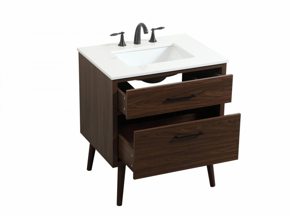 This bathroom vanity is a perfect way to outfit your home in authetic midcentury modern style. The clean lines anchors the design, while the oblique tapered cylinder legs add subtle interest. A black handle adorns the top drawer hiding the base of the undermount porcelain sink while another one allows you to pull the bottom drawer out, letting you store your bathroom necessities and toiletries. The storage drawers provide much needed function and can be used for stowing items like extra toothbrushes, hairbrushes, and other bathroom essentials to help you get ready to face the day. This vanity is a quick update for your bathroom with trendy style.