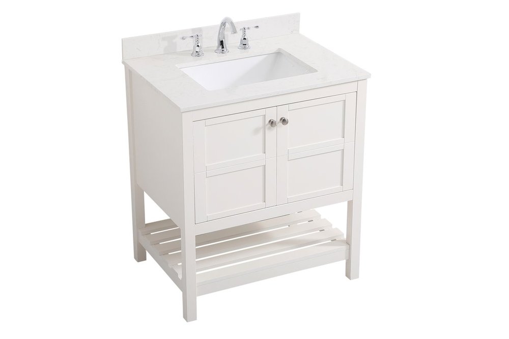 The subtle beauty of the Theo collection 30" vanity in a white finish exudes comfortable luxury. Its modern, yet traditional beauty will surely dress up your bathroom or powder room without any fuss. The white stone countertop and porcelain undermount sink shows quiet opulence, and the legs support upright without fail. Brushed Nickel hardware complements the trendy white finish, with pulls adorning the two cabinet doors, showcasing ample storage space within. Slated shelf allows for additional space to organize your towels. Whether this vanity is in your bathroom or for guests, its presence will surely elevate the aesthetics of your room. Comes with a matching backsplash to complete the look and protects your wall.