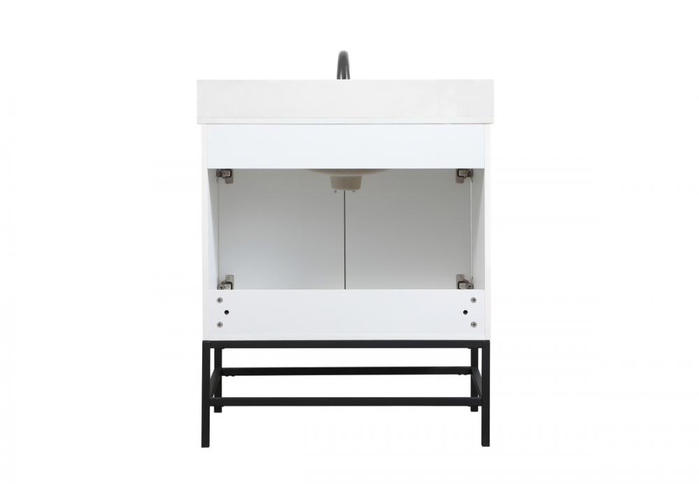 This vanity is a sleek-looking piece of bathroom furniture that is easy to incorporate into your design scheme. The cabinet features a smooth door panel with an oversized steel handle and soft close hinges provide ample room for accessories. Constructed of engineered wood, the powder-coated metal rod legs are an urban industrial look that we love. Minor assembly of the metal legs needed to get this vanity up and running. Comes with a matching backsplash to complete the look and protects your wall.