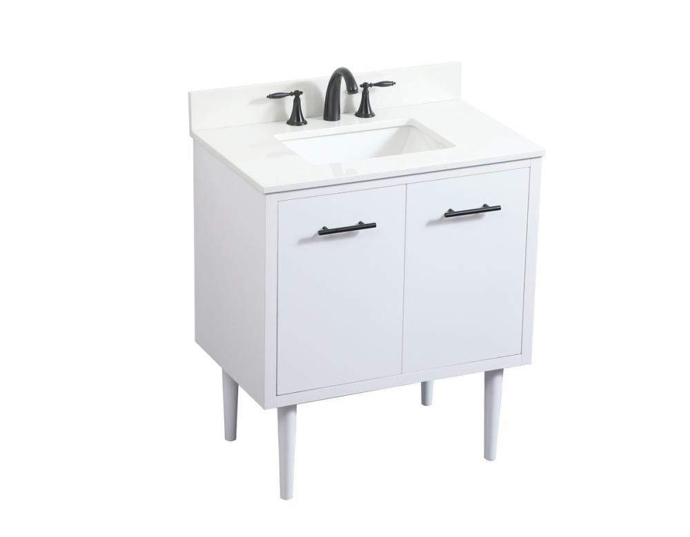 Delve into a world of minimalistic fashion and contemporary styling with this midcentury modern vanity. The clean lines anchors the design, while the straight tapered cylinder legs add subtle interest. Bar pull handle adorns the soft closing door hiding the base of the rectangular porcelain sink and letting you store your bathroom necessities and toiletries. Whether you want to use this as a floating vanity or a freestanding vanity, the choice is yours. The durable ivory white engineered marble countertop complements the manufactured wood base vanity and is built to last. Comes with a matching backsplash to complete the look and protects your wall.