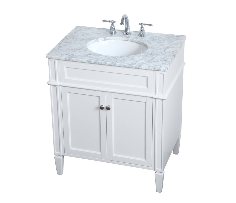 Modern sophistication is defined within the urbane white finish and brushed steel knobs of this compact vanity. Its length makes it the perfect addition to any sized home, and saves space with its storage area hidden behind the double cabinet doors. Topped with a Carrara white marble counter top and a porcelain sink, this design will add everlasting class to your bathroom and powder room.