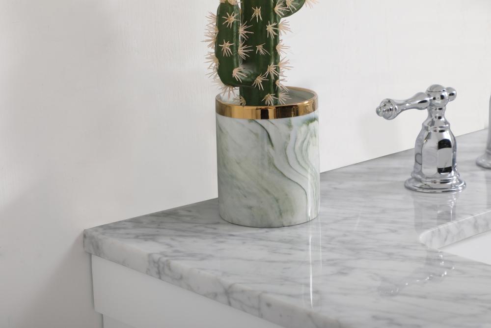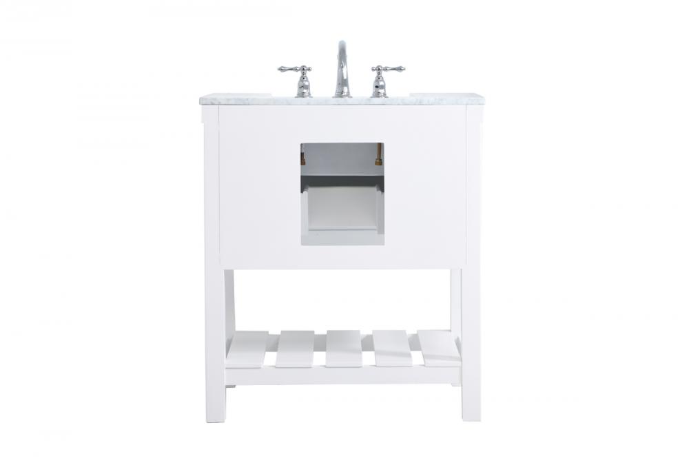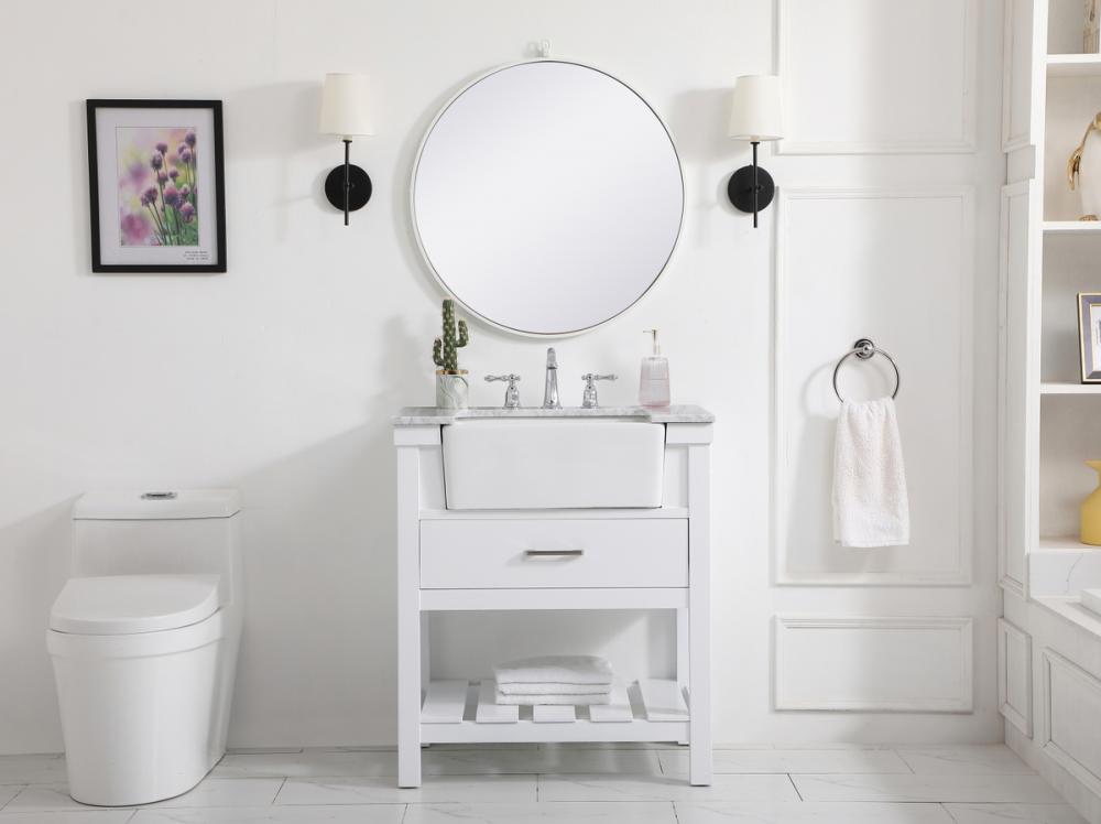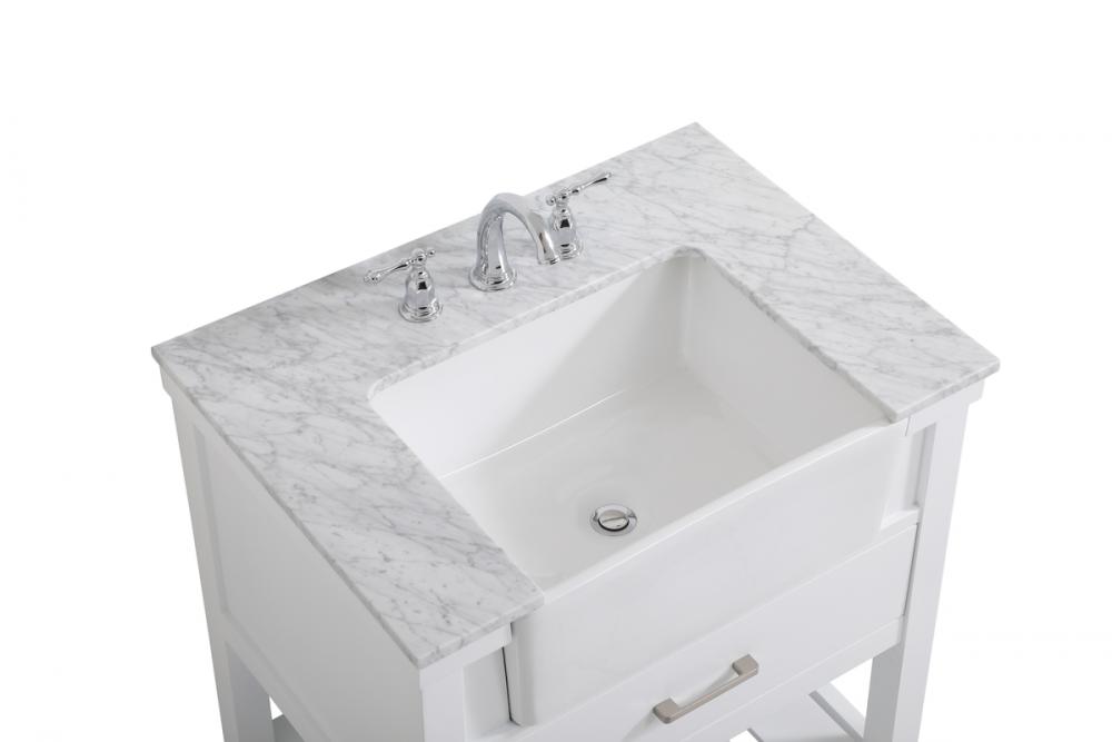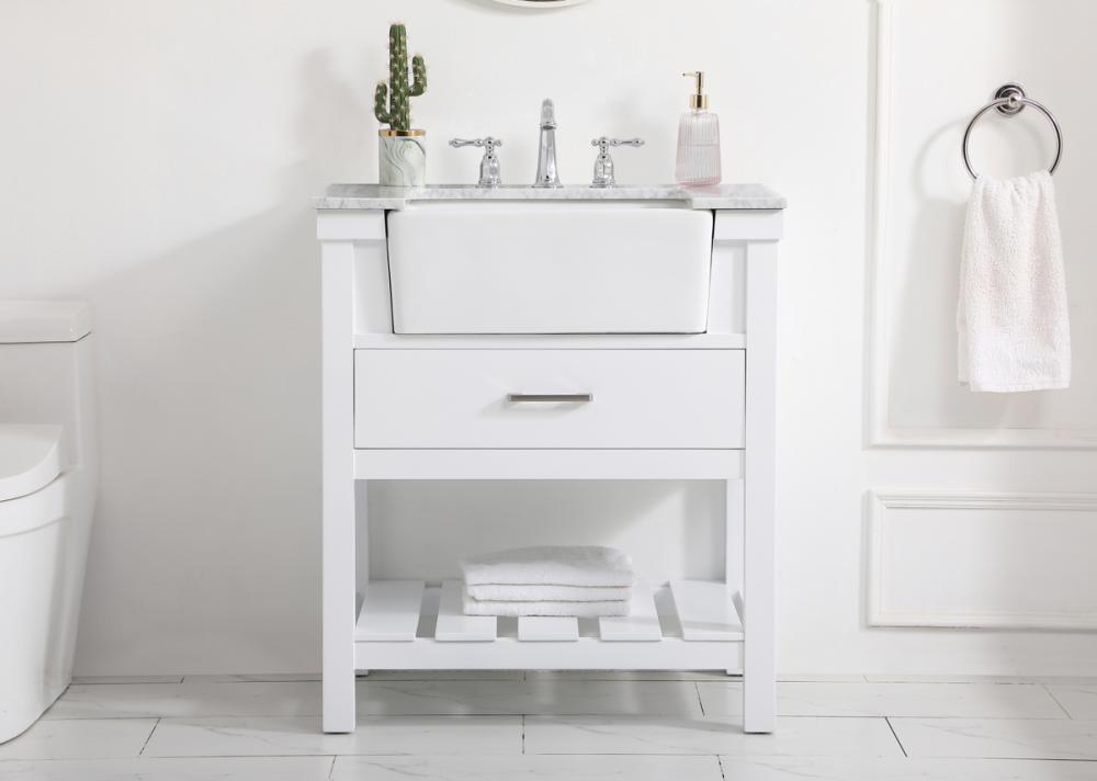 Make the most of your space with this farmhouse style bathroom vanity. Complements well with its beautiful finish, carrara white marble countertop, and the contemporary slender handle bar that sits on the functional drawers with soft closing mechanism, allowing you to store an assortment of bathroom essentials. The lower shelf makes it the perfect space to hold new towels for your guests. This stylish vanity ensures both form and function in your bathroom for you and your guests.