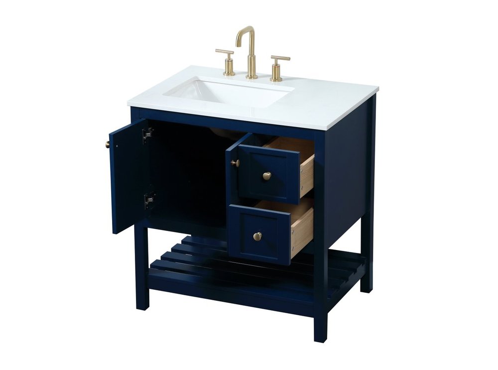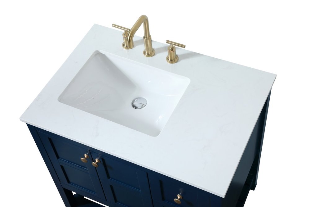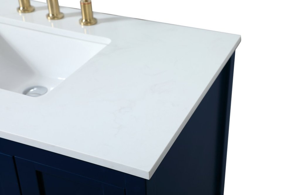 The subtle beauty of the Theo collection vanity exudes comfortable luxury. Its modern, yet traditional beauty will surely dress up your bathroom or powder room without any fuss. The calacatta engineered marble countertop and porcelain undermount sink shows quiet opulence, and the legs support upright without fail. Brushed gold hardware complements the trendy blue finish, with pulls adorning the two cabinet doors, showcasing ample storage space within. Slated shelf allows for additional space to organize your towels. Whether this vanity is in your bathroom or for guests, its presence will surely elevate the aesthetics of your room.